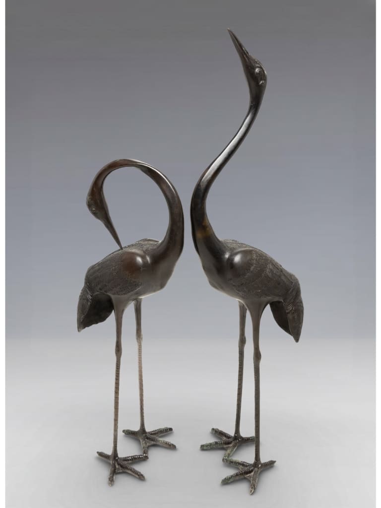 The pair is designed as a balanced composition; the upward-reaching neck of one crane provides a dramatic verticality that is perfectly countered by the intimate, curved silhouette of its companion.