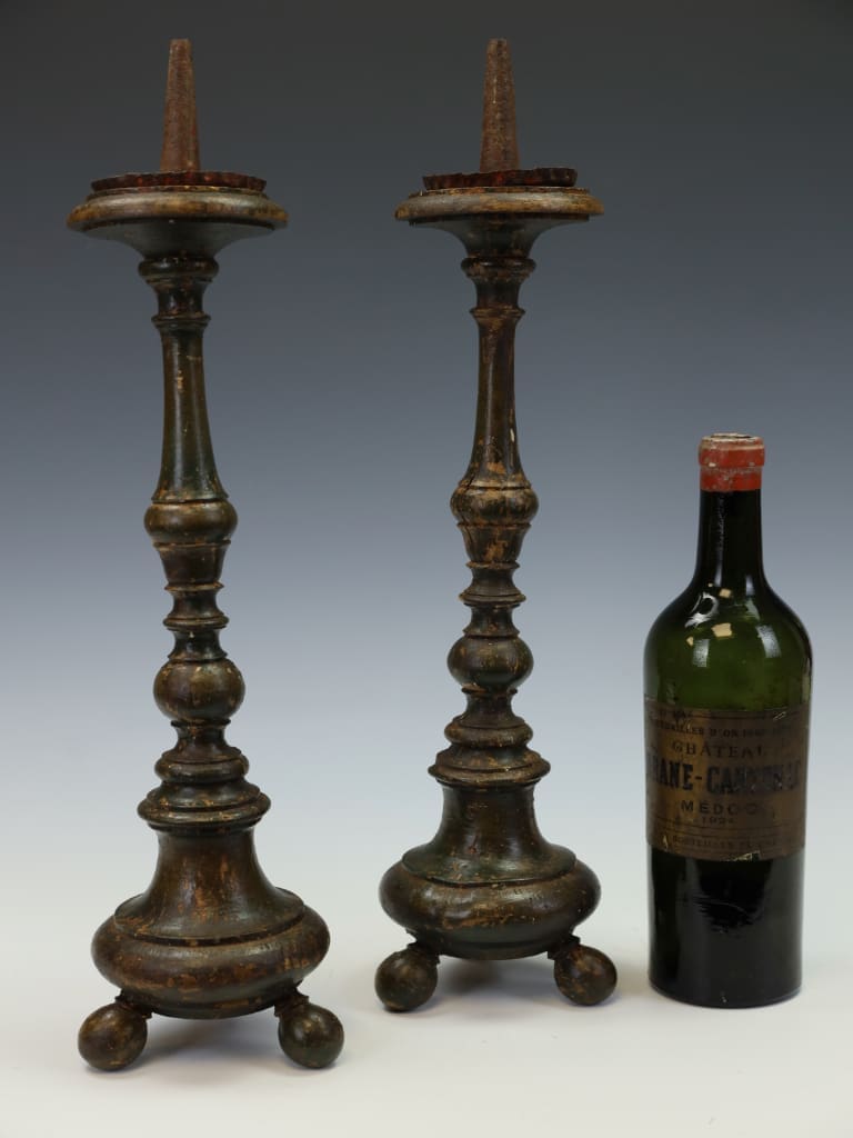 The lead-weighted bases are original and intact. One candlestick sits slightly off-centre when placed in a particular position, attributable to hand manufacture and natural movement of the timber over time; this is entirely consistent with period altar furnishings and should be regarded as part of their authentic character rather than a defect.