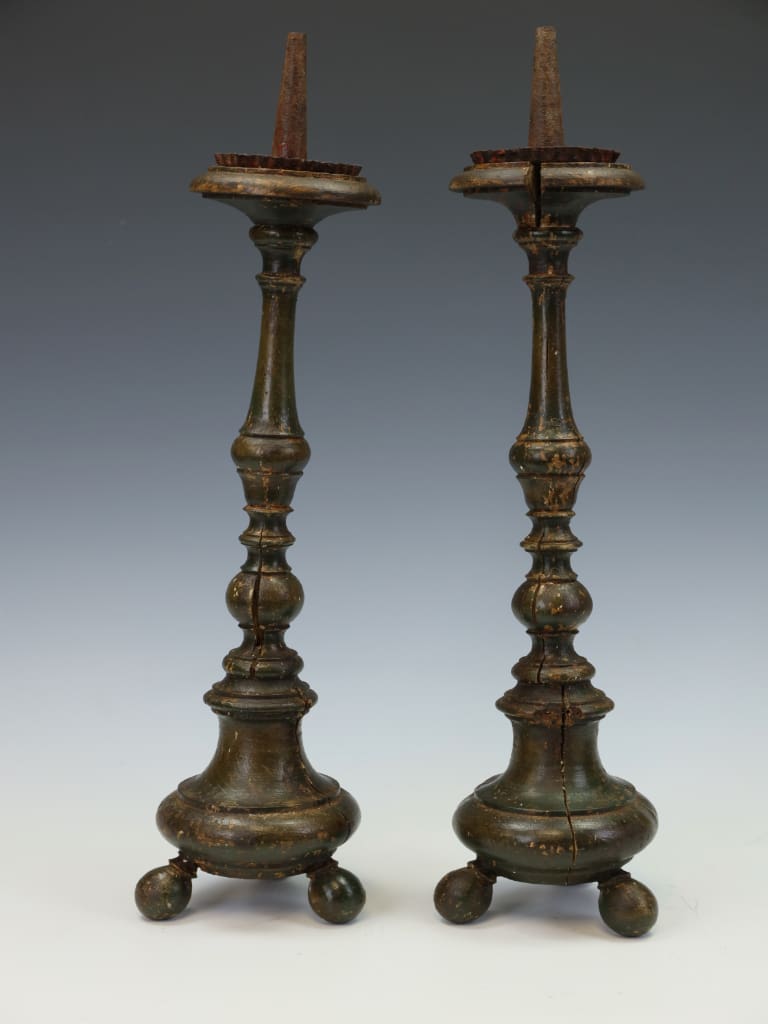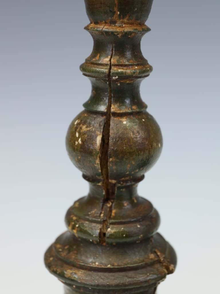 Both candlesticks retain their original painted surfaces, showing expected and honest wear throughout, including areas of rubbing, surface losses, and softening to the carving from centuries of handling and exposure to candle smoke. There are natural age-related splits to the wood, typical of early turned ecclesiastical pieces and in no way compromising the structural integrity.
