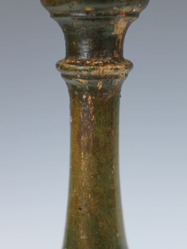 Hand-carved and turned from solid wood, the candlesticks retain their original dark grey-green painted surface, untouched and richly patinated. The surface shows honest wear throughout, with areas of rubbing, surface losses, and natural age-related splits to the timber, all entirely consistent with prolonged devotional use. These elements are not flaws but clear markers of authenticity and originality.