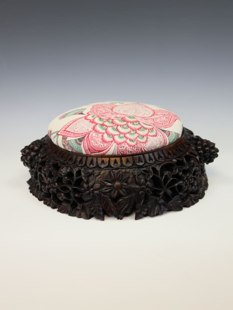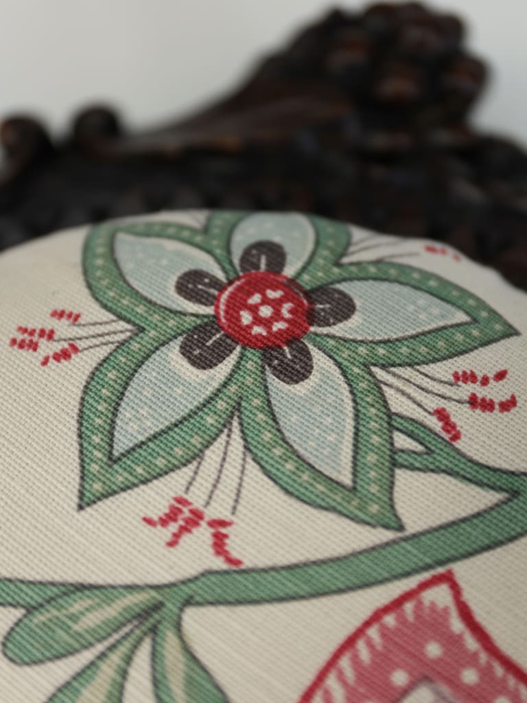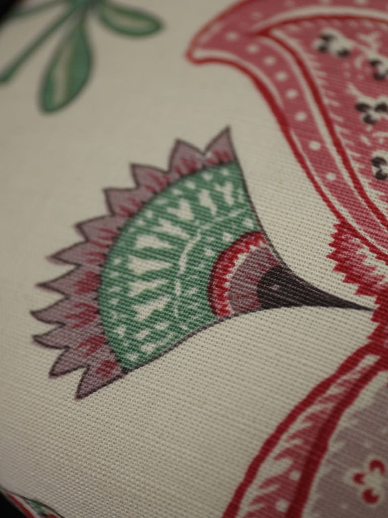 Inspired by 18th-century Indienne textiles, Banyan is hand-printed in England using traditional screens. Its "Tree of Life" pattern features flowing floral trails that create a visual dialogue with the carved vines below.