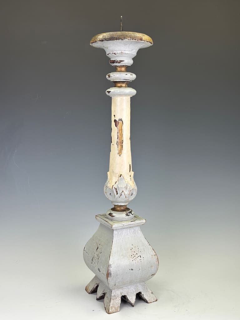 Retains its original painted surface, now attractively distressed with age. Areas of flaking, rubbing, and surface losses reveal underlying gesso and earlier paint layers, contributing to a richly textured, timeworn appearance. No evidence of overpainting or restoration. Candlestick has been given a polish with beeswax to reduce flaking.