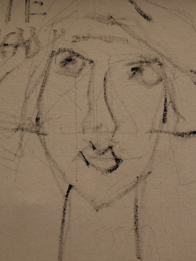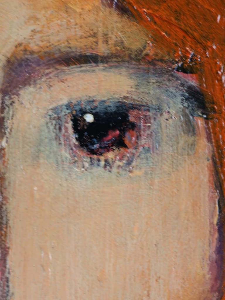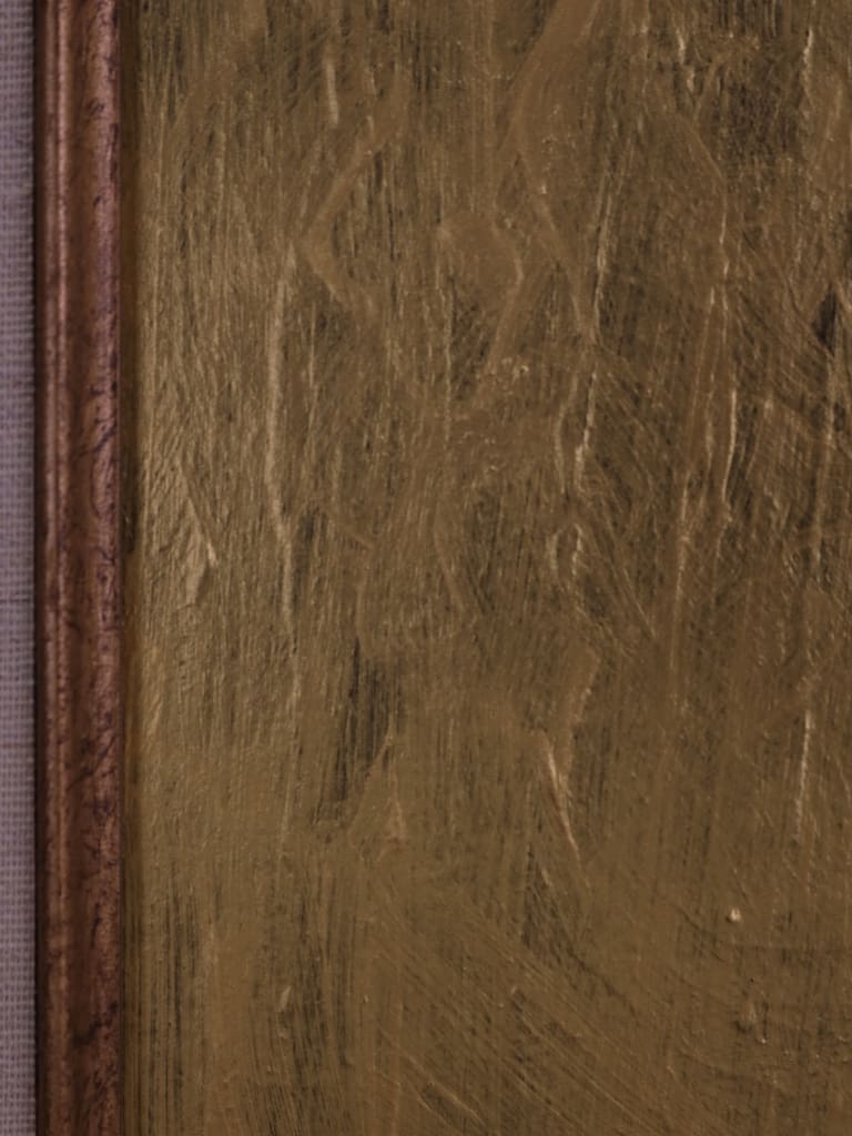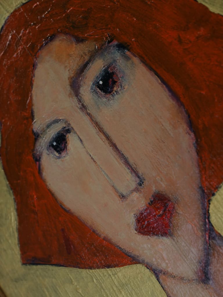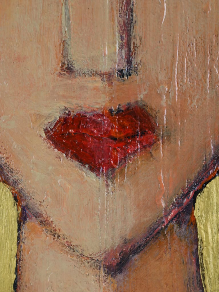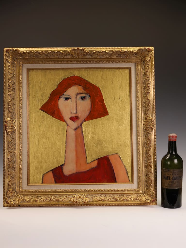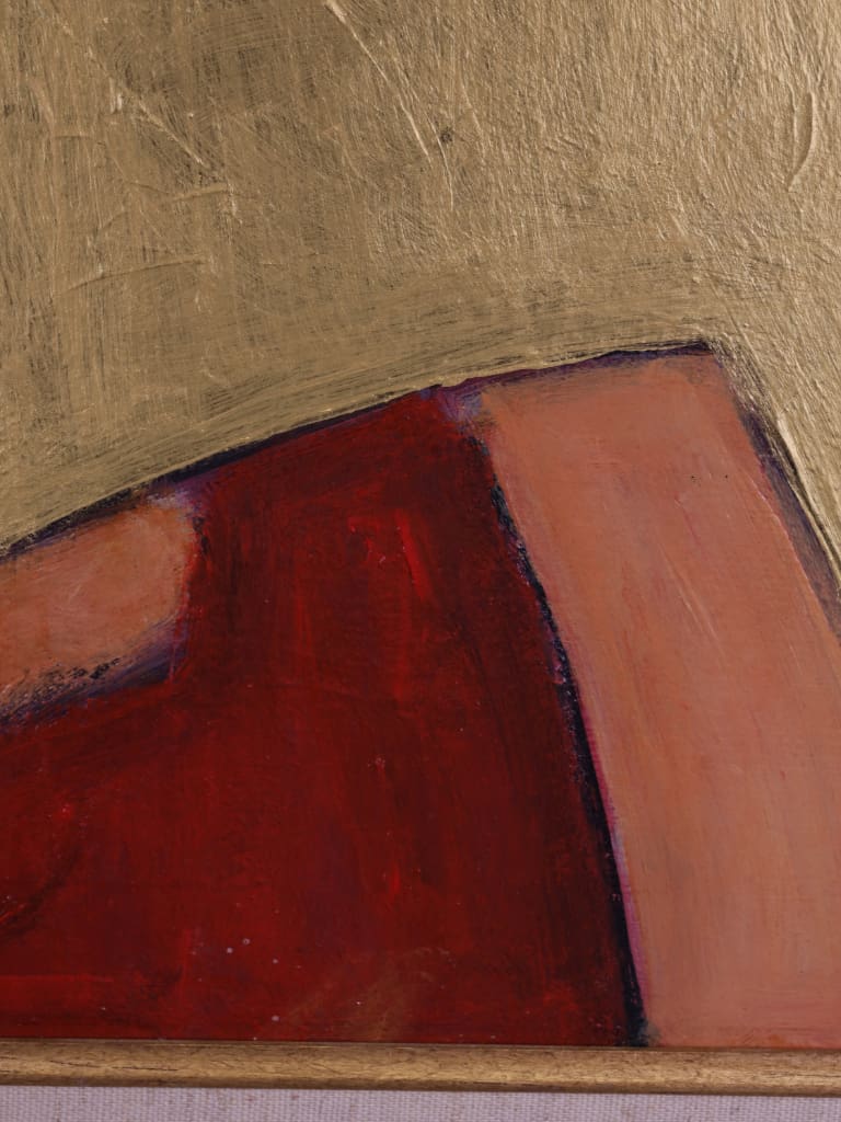 Executed in rich, expressive layers, the palette of burnished reds and ochres is set against a luminous gold ground, imbuing the composition with warmth and an almost iconic presence. The delicate modulation of tone and texture demonstrates Tim’s assured handling of oil and his subtle exploration of character through abstraction.