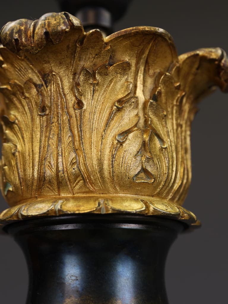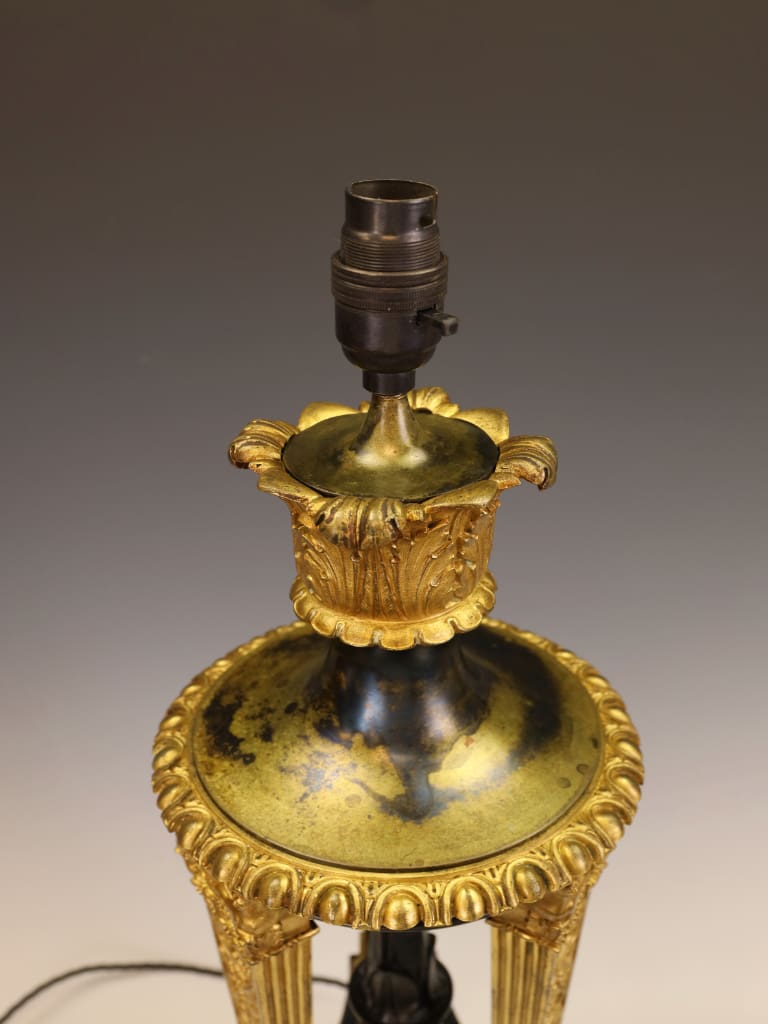 The columns frame a central stem supporting a foliate capital, originally intended to house the oil reservoir and burner and now sensitively adapted for modern use. The lamp retains a superb original surface, with deep, dark patination contrasting beautifully against the burnished gilding, lending the piece considerable visual authority and sculptural depth.