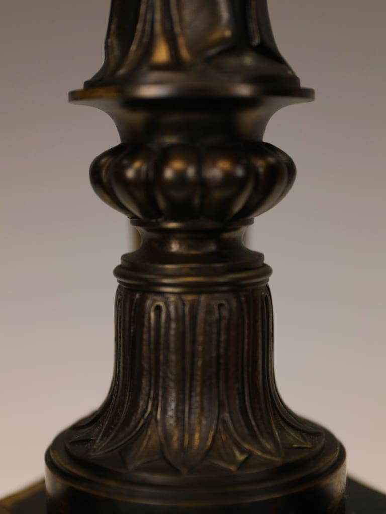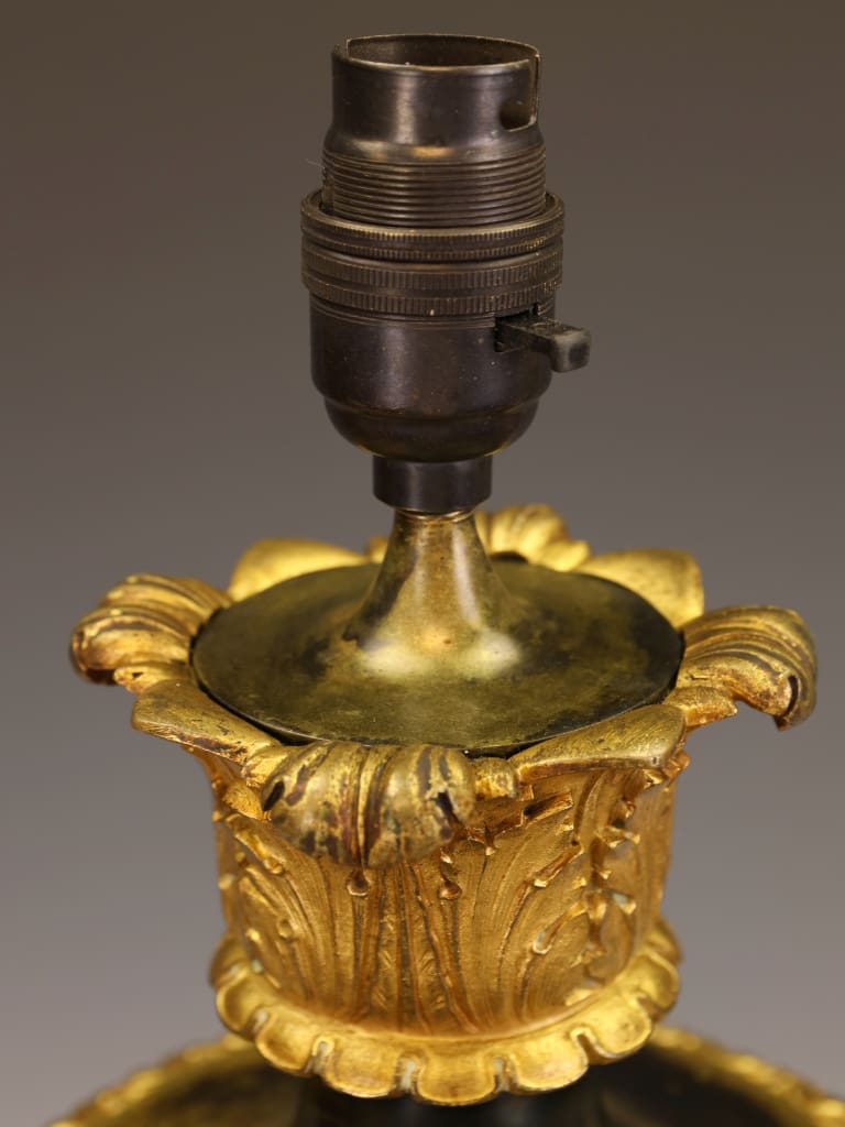 Overall in very good condition, consistent with age and use. There is some rubbing to the bronze surface, resulting in areas of lighter and darker patination, which enhances the depth and character of the piece. Minor tarnishing to the gilt is present in places, commensurate with age. The lamp has been fully rewired, PAT tested and is ready for use.