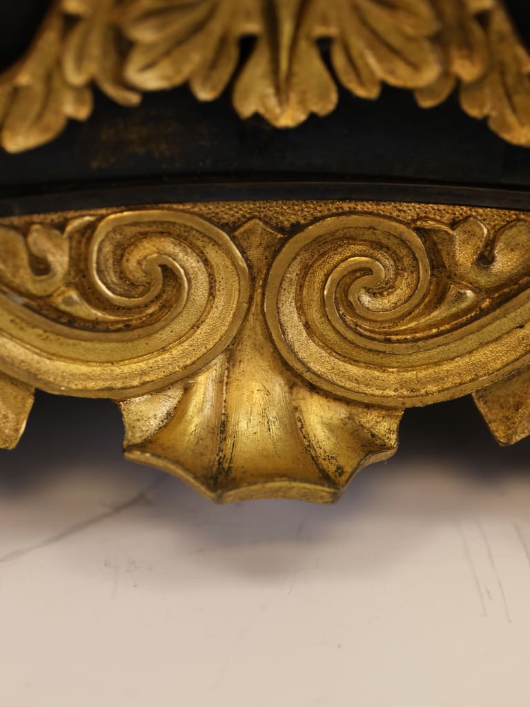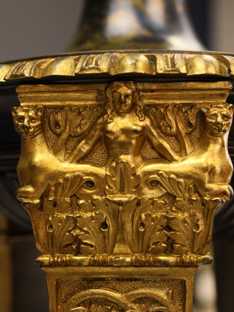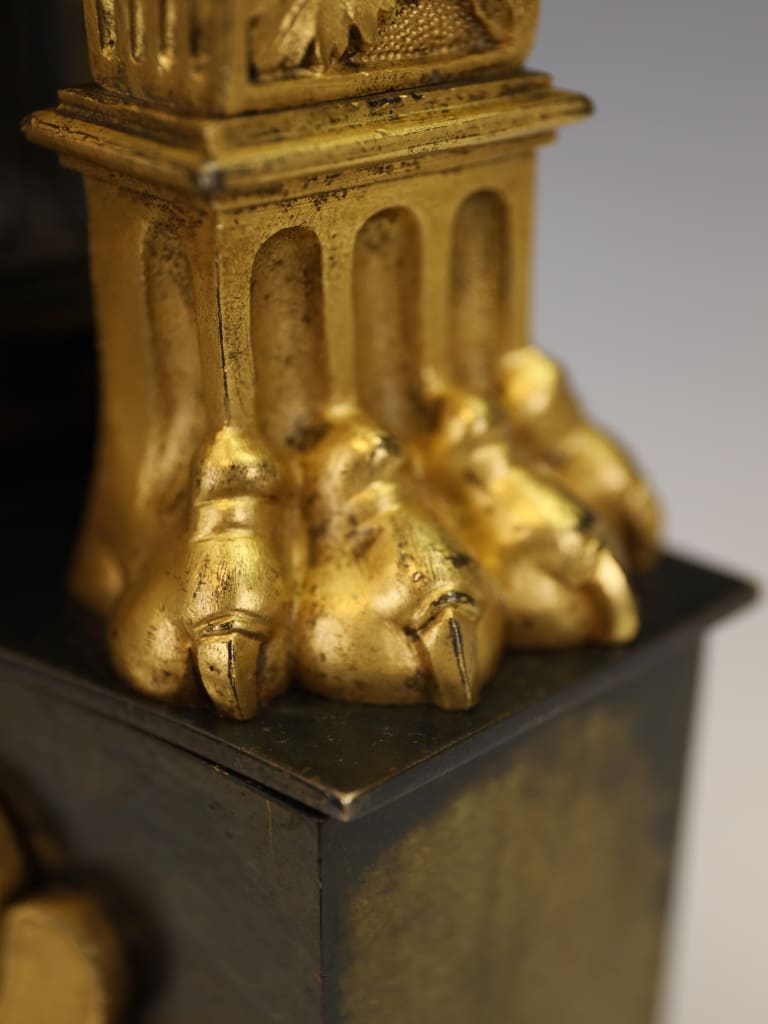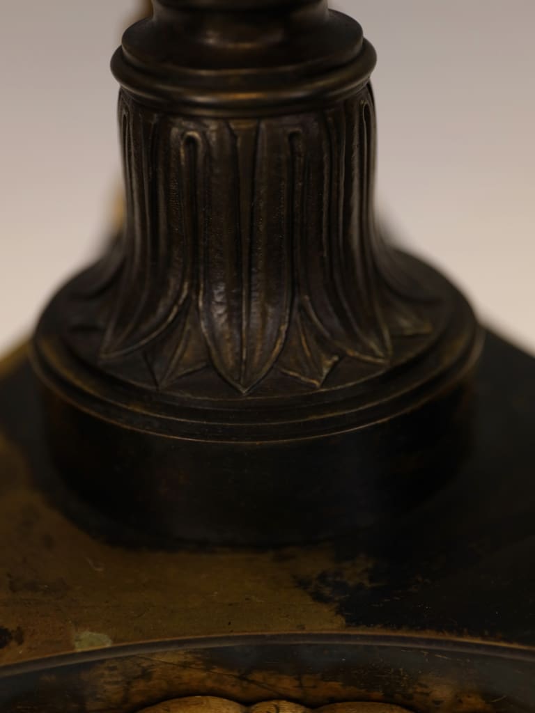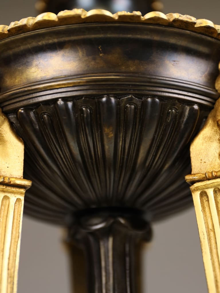 Rising from the base are three richly ornamented columns, each standing on lion’s feet and surmounted by a pair of finely cast sphinxes. These Egyptianising motifs reflect the profound influence of classical scholarship and archaeological discovery on Regency design, particularly in the wake of the Napoleonic campaigns in Egypt and the subsequent publication of the Description de l’Égypte, which significantly shaped European decorative arts of the period.