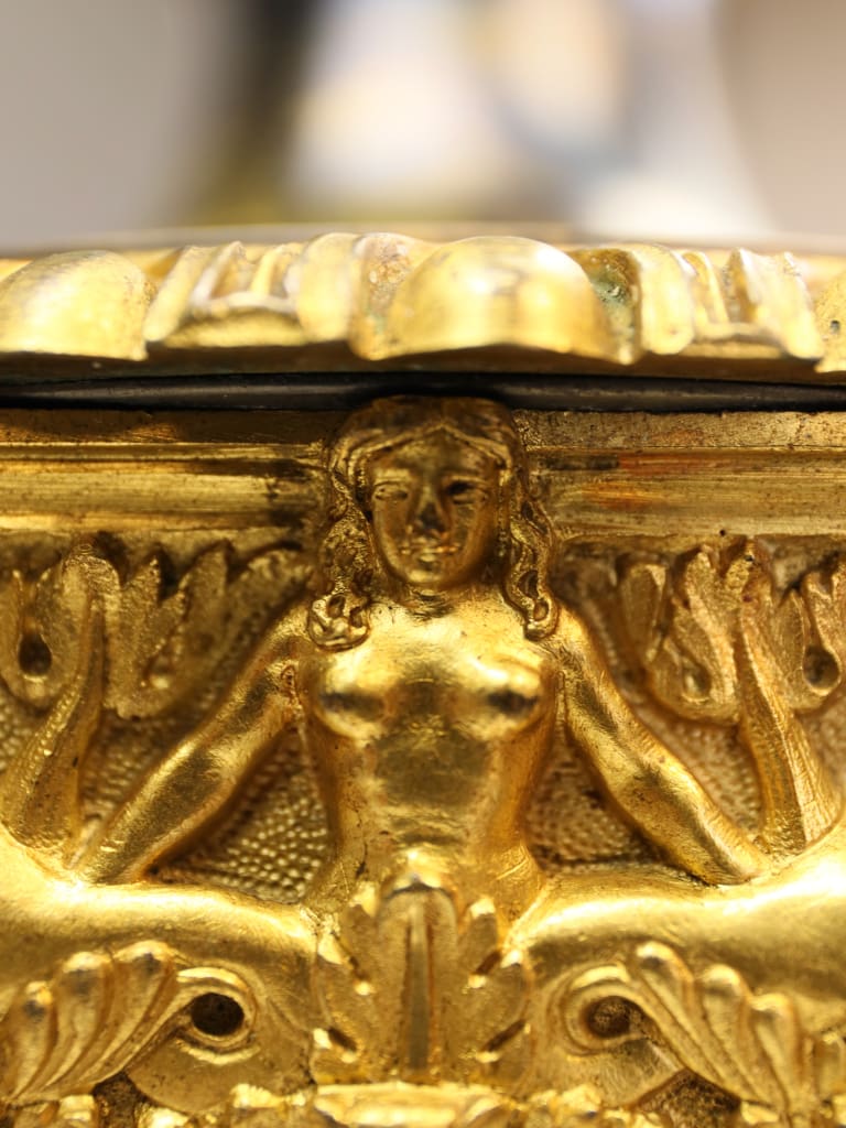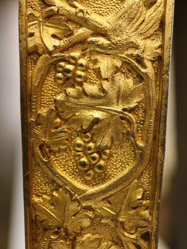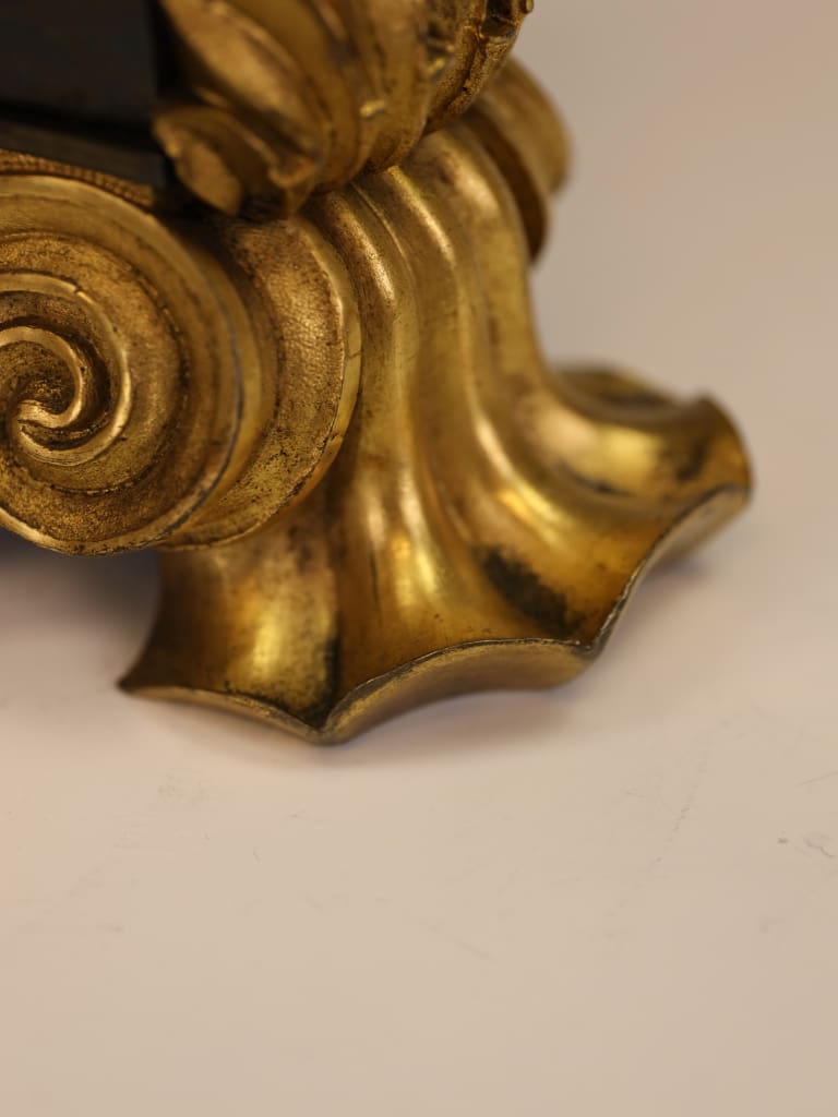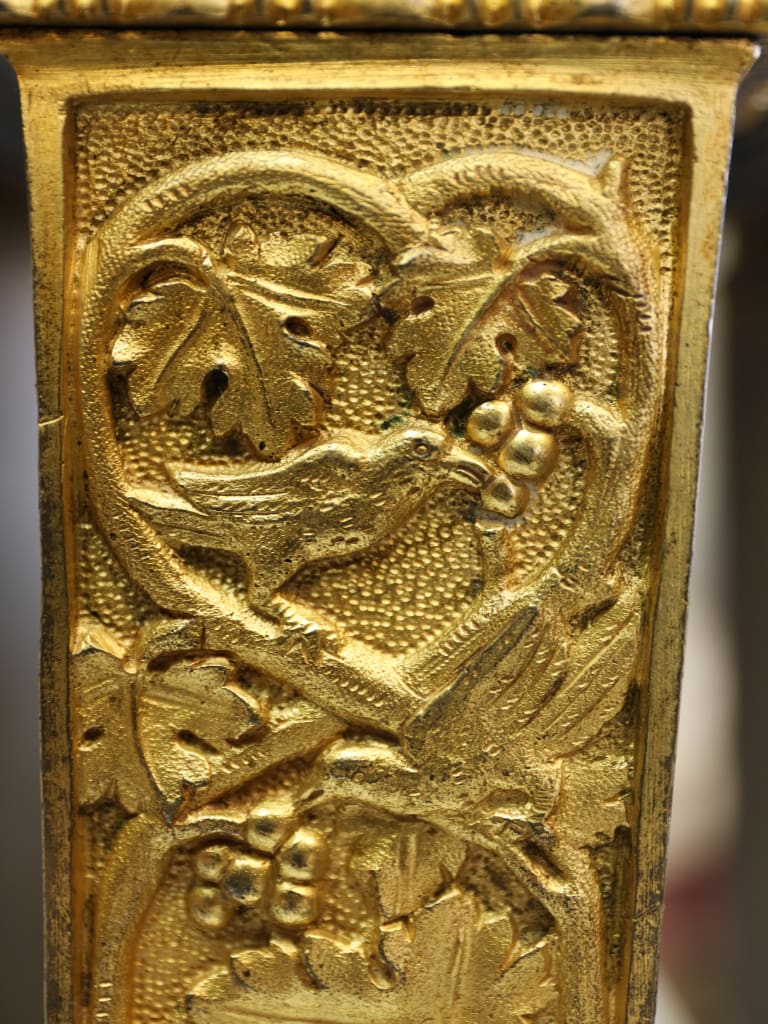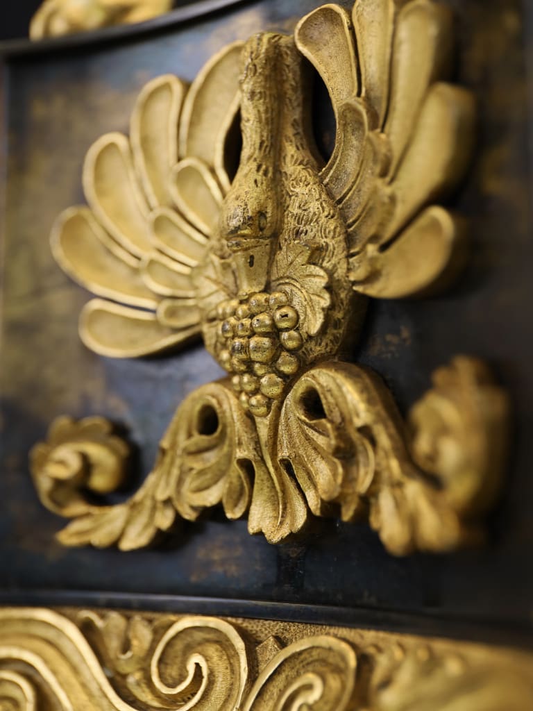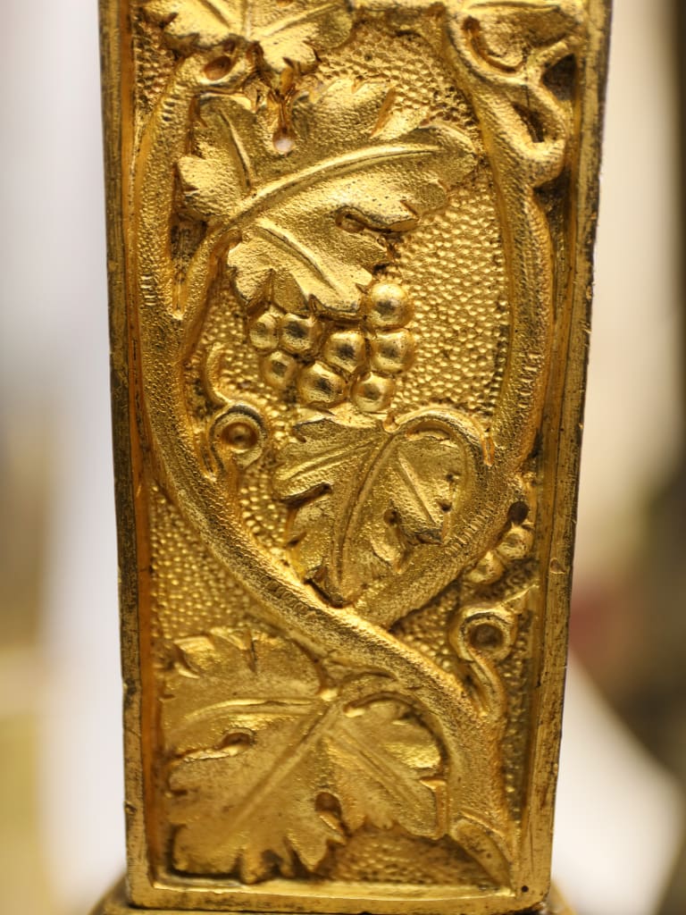 Rising from the base are three richly ornamented columns, each standing on lion’s feet and surmounted by a pair of finely cast sphinxes. These Egyptianising motifs reflect the profound influence of classical scholarship and archaeological discovery on Regency design, particularly in the wake of the Napoleonic campaigns in Egypt and the subsequent publication of the Description de l’Égypte, which significantly shaped European decorative arts of the period.