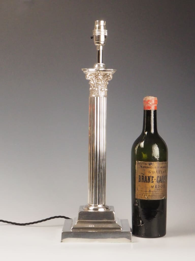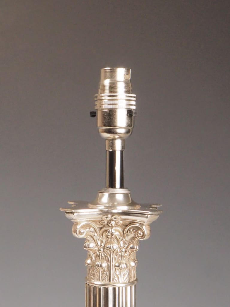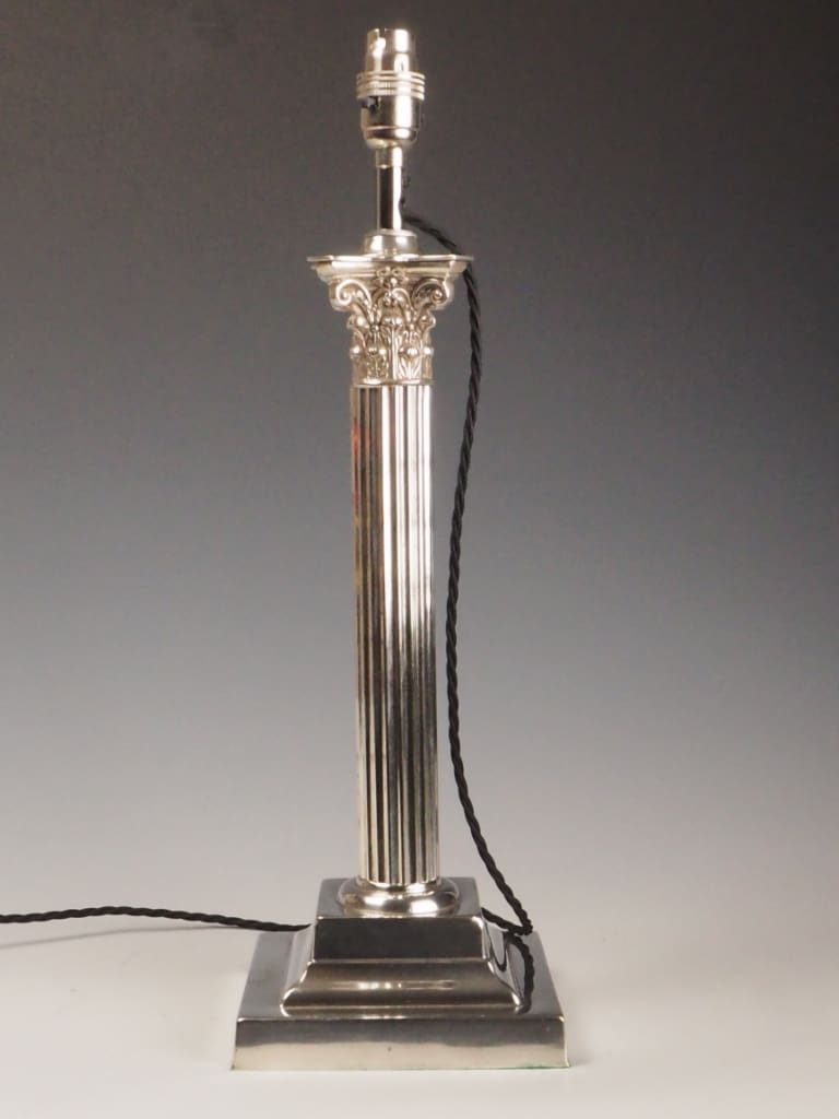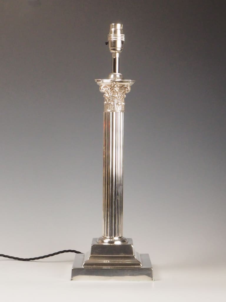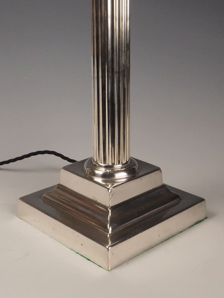 A handsome late 19th-century silver-plated table lamp featuring a classic Corinthian column design, echoing the grandeur of neoclassical architecture. The fluted shaft is topped with an ornate Corinthian capital adorned with acanthus leaf motifs, all standing on a stepped square base with clean, reeded detail that adds architectural presence and timeless appeal.