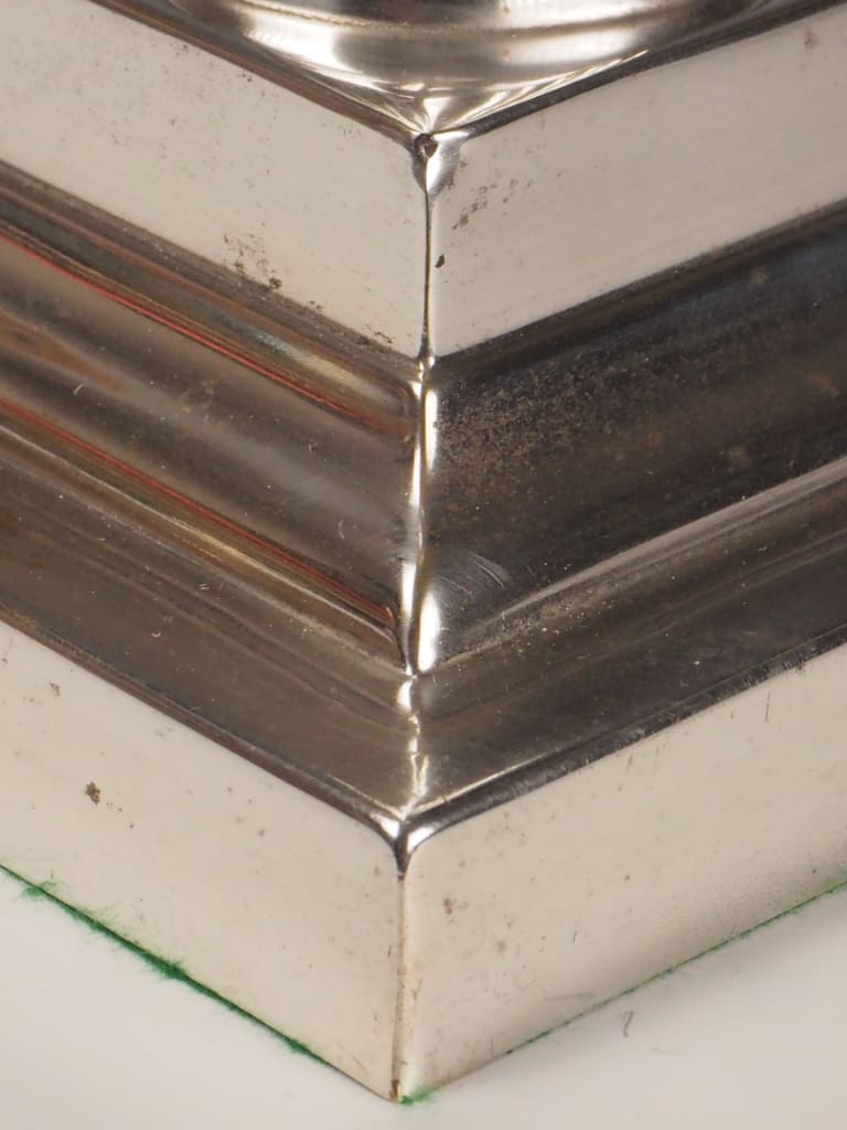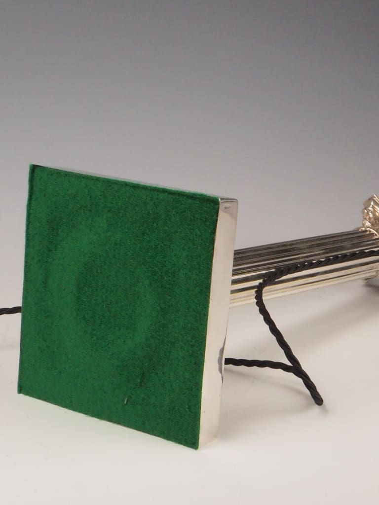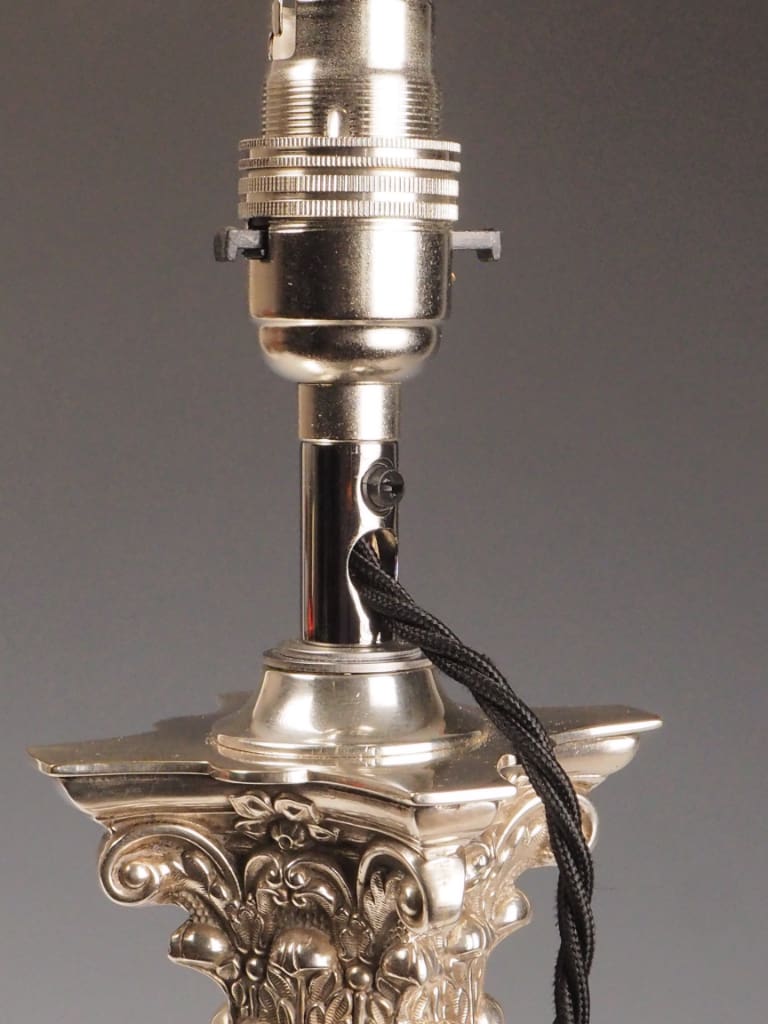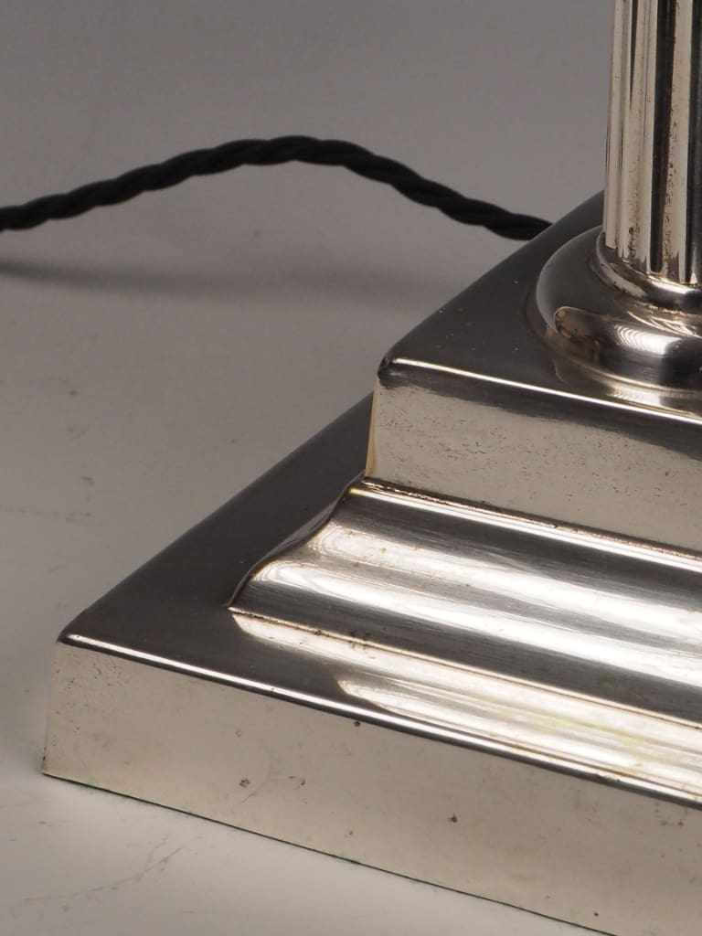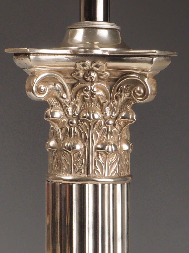 Silver Plating: The silver plate remains bright and well-preserved across the column, capital, and base. Some light surface marks and small areas of natural patina are visible, enhancing the lamp’s character without detracting from its aesthetic appeal. There are no significant losses or corrosion evident.