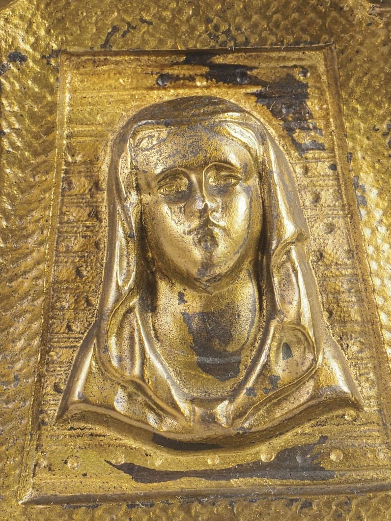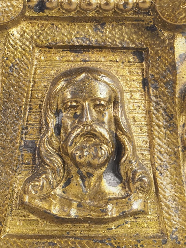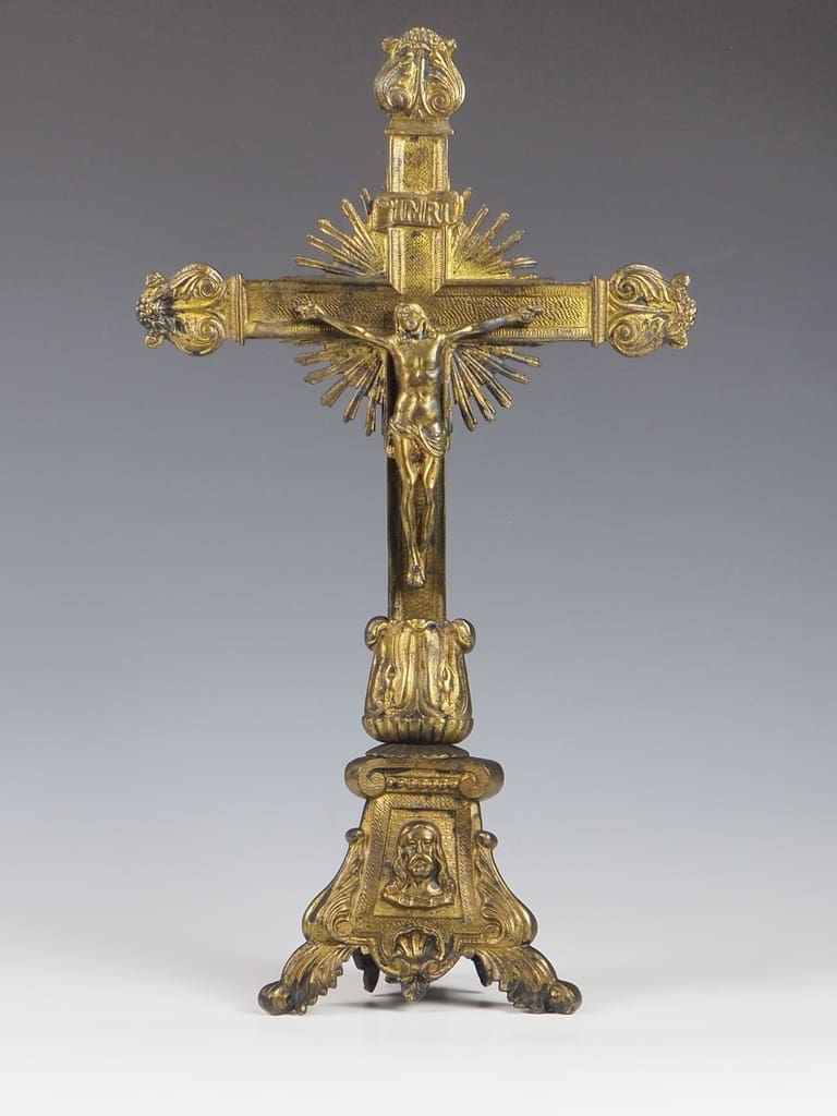 During the late 19th and early 20th centuries, Belgium was renowned for its skilled artisans and craftsmen who produced religious artefacts of exceptional quality. The use of gilt bronze in religious items like this crucifix was common, as it not only provided a luxurious appearance but also symbolised the preciousness of the divine.