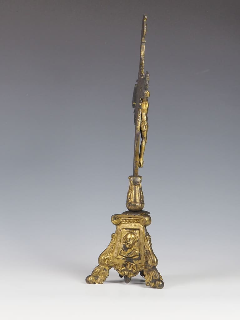 This antique gilt bronze crucifix cross is in good antique condition, showcasing signs of wear consistent with its age. These signs of wear add to its historical charm without detracting from its overall appearance.