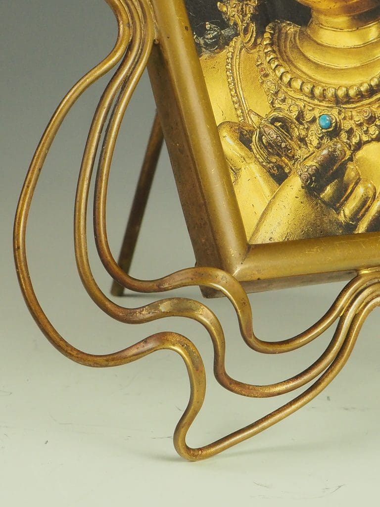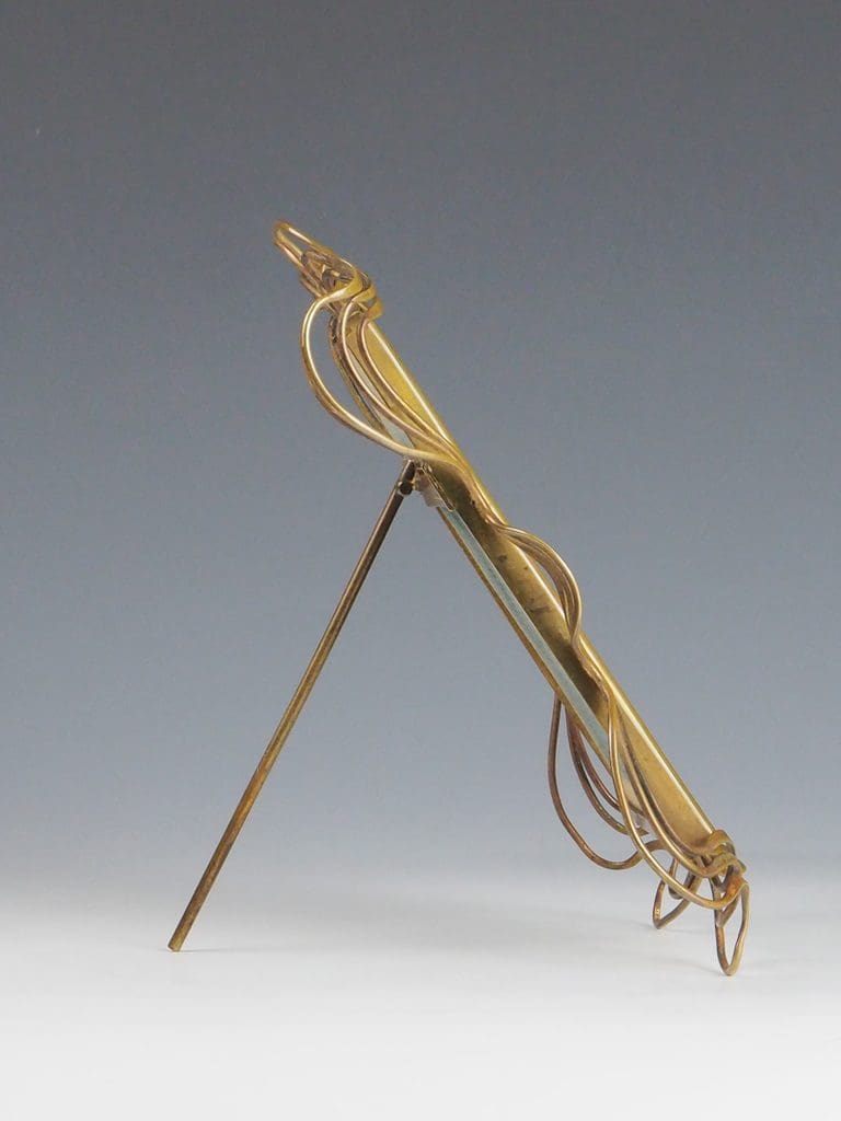 Crafted from solid brass, the frame boasts a warm patina that enhances its antique allure. The unusually intricate wire frame design reflects the meticulous craftsmanship of the era, combining functionality with artistic sophistication. Its easel stand ensures both stability and versatility, making it an ideal centerpiece for any display, be it a cherished family photograph or a work of art.
