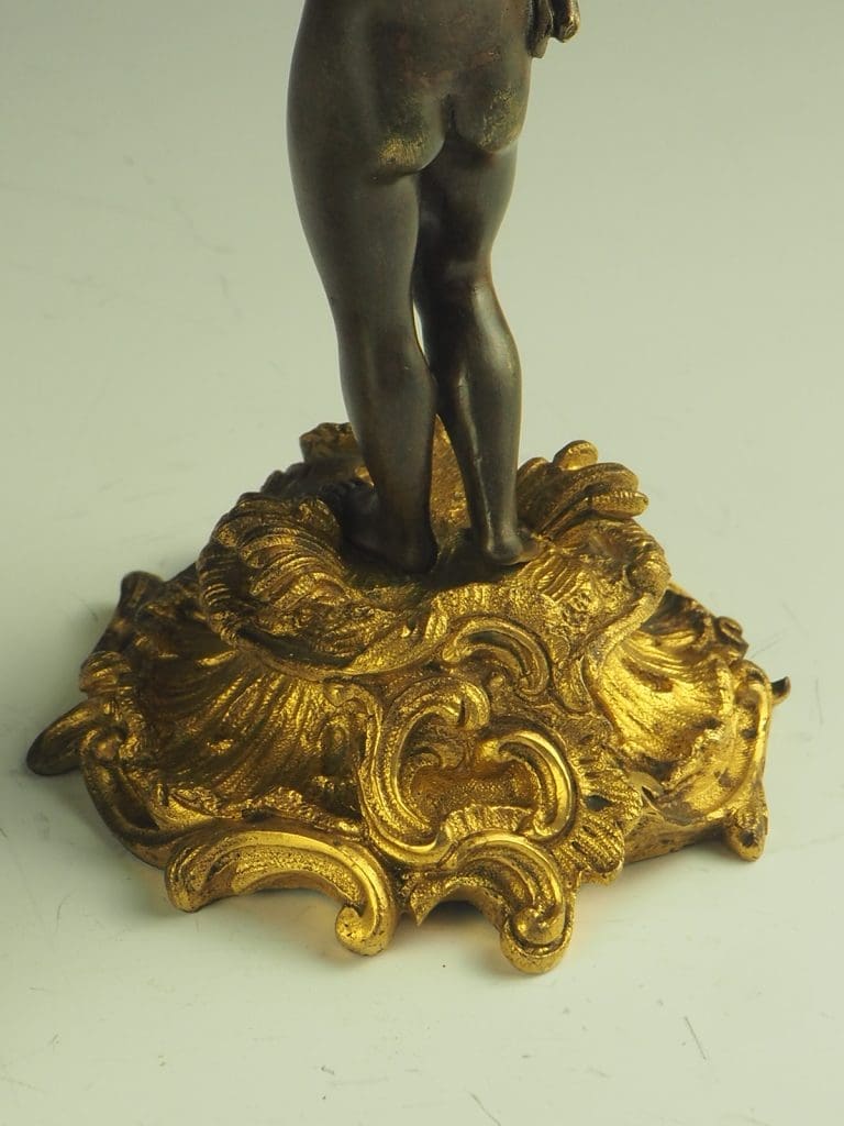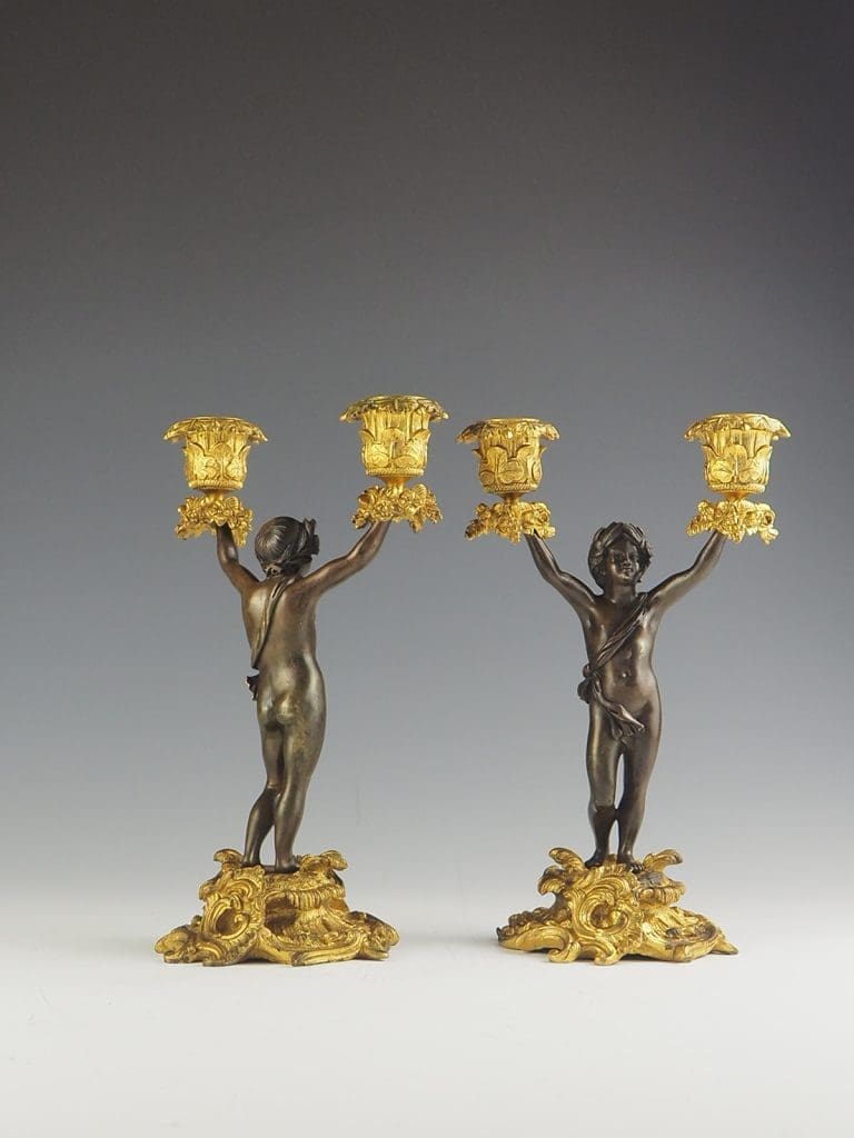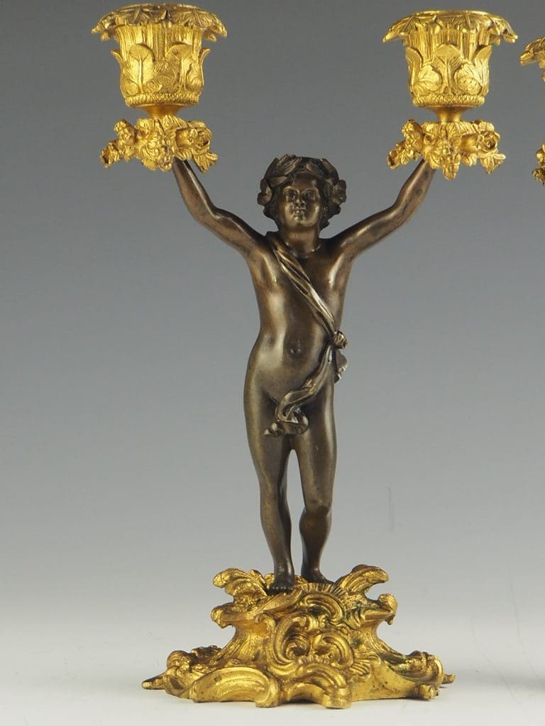 Whether displayed as a centerpiece on a dining table or as an accent piece in a grand living room, these bronze and gilt ormolu twin cherub candelabras are sure to captivate and impress with their intricate detailing and timeless beauty.