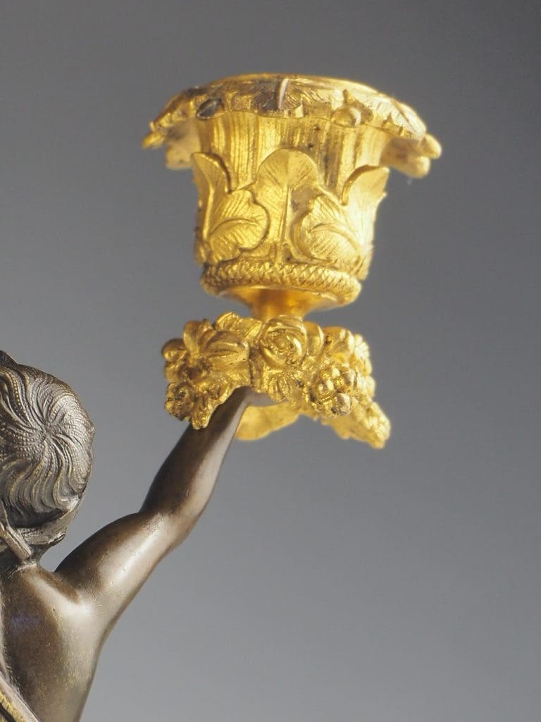 The cherubs are depicted holding twin gilt bronze candle candelabras, which are intricately decorated with delicate vine leaves and grapes. These decorative elements add a touch of elegance and sophistication to the overall design.Â