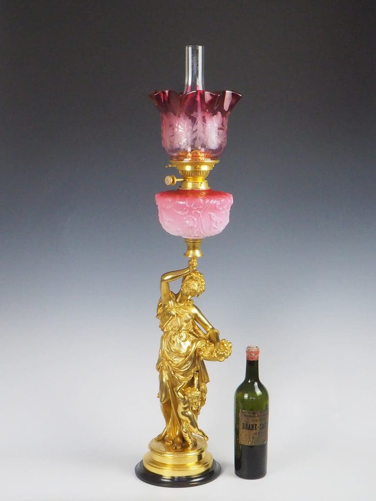 A Magnificent 19th-Century Work of Art and Historical Significance. This extraordinary oil lamp, signed by the acclaimed French sculptor Carrier-Belleuse, exemplifies the artistry and innovation synonymous with 19th-century design. Renowned for his influential role in the Neo-Classical movement, Carrier-Belleuse masterfully merged artistic beauty with functional utility. Produced during an era when oil lamps symbolized both practicality and social prestige, this exceptional piece is a testament to the cultural refinement of its time.