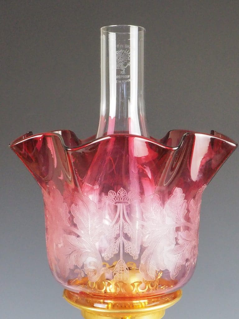 The oil font held by the lady is in excellent condition, featuring no cracks or chips. The glass shade is intact.