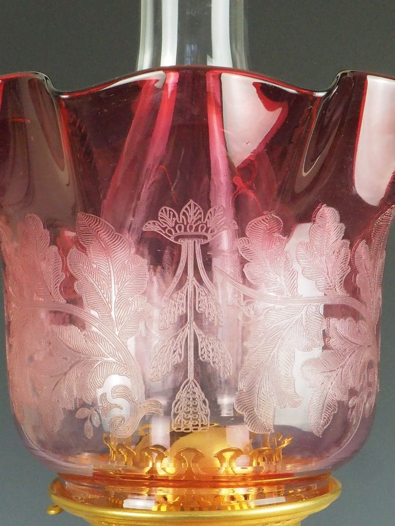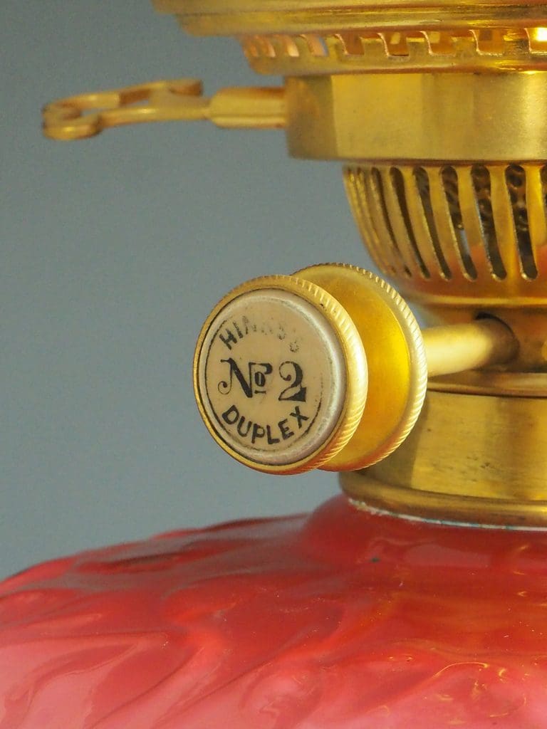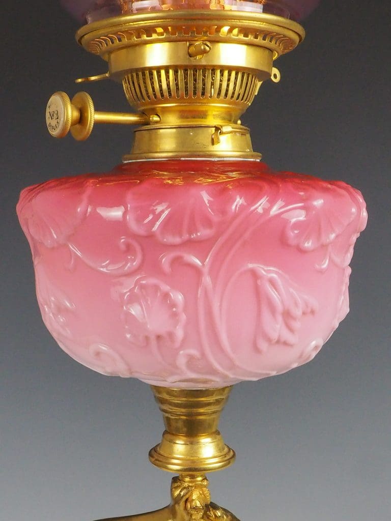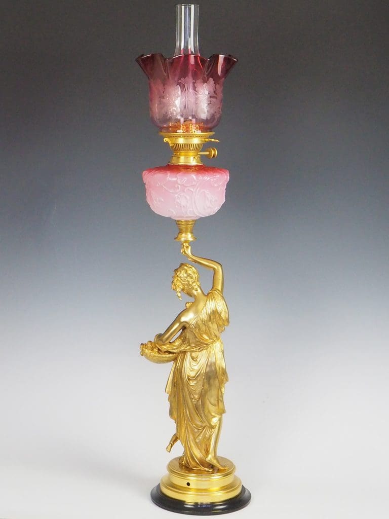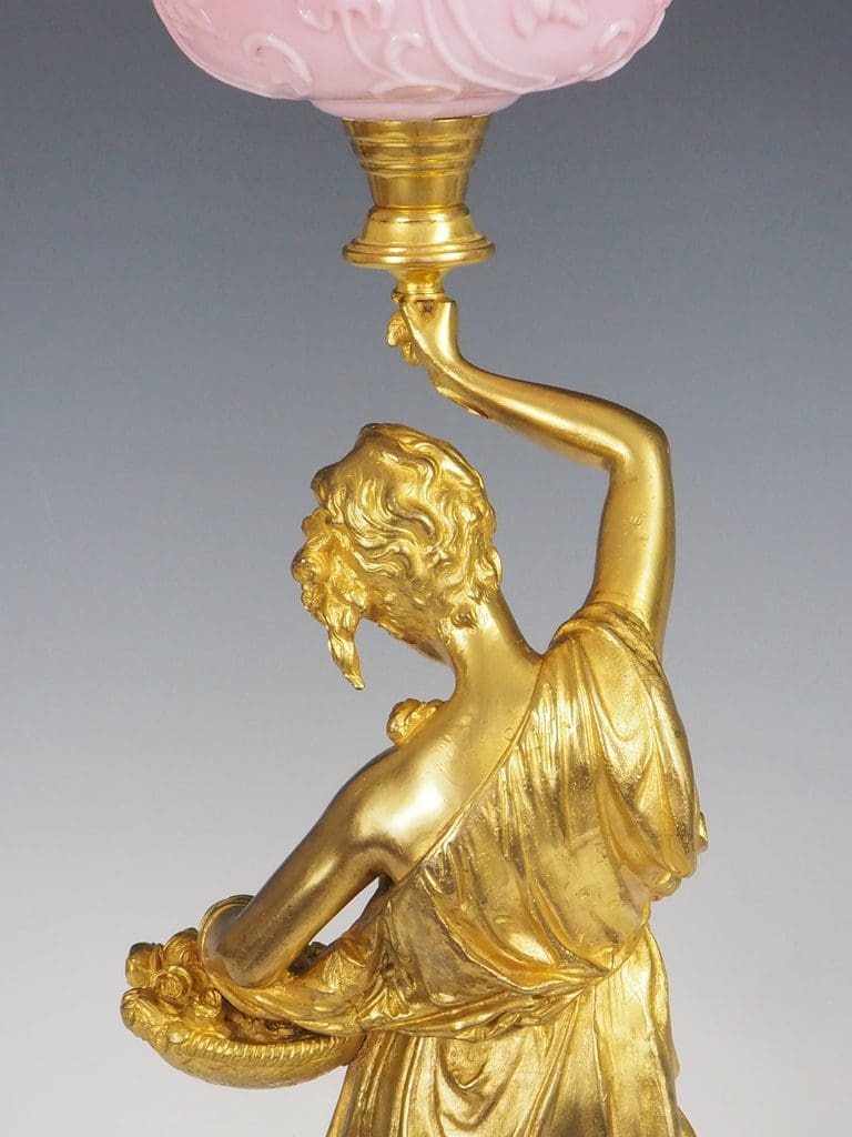 At its core is an exquisitely crafted gilt bronze scene featuring a lady and boy, rendered with meticulous detail and timeless sophistication. The lady holds a rare pink font with a Hicks No. 2 oil burner, further complemented by a finely designed glass shade that enhances its visual appeal. The gilt bronze work represents the remarkable standards of craftsmanship that defined the late 19th century, serving as an enduring tribute to the skill and creativity of its makers.