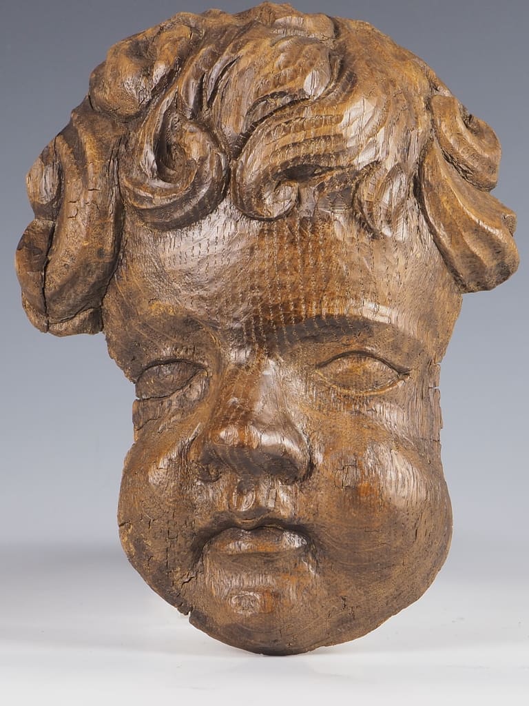 Cherubs, often depicted as angelic children, have been a popular motif in art and architecture since the Renaissance period. Originating in religious contexts, cherubs symbolised divine love and innocence. By the 18th and 19th centuries, these figures became common decorative elements in European art, particularly in the Baroque and Rococo styles. The craftsmanship of this cherub head reflects the artistic sensibilities of the period, characterised by intricate detailing and a focus on naturalistic forms.