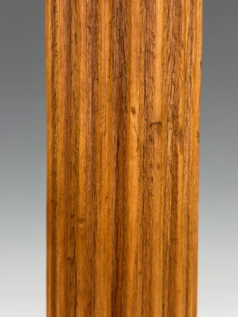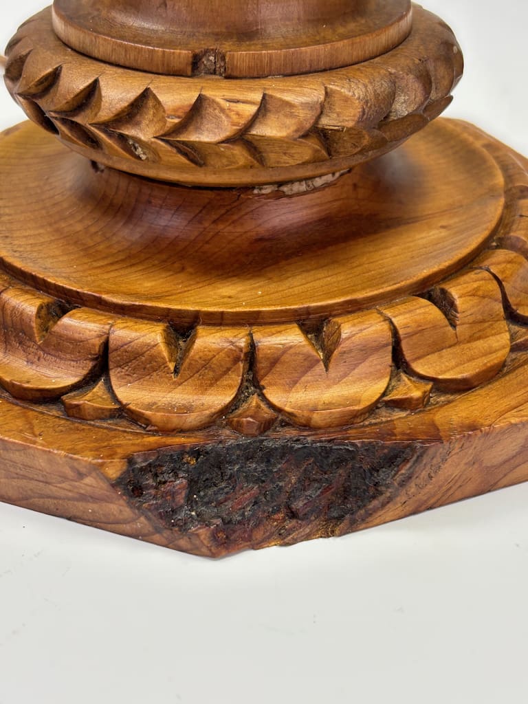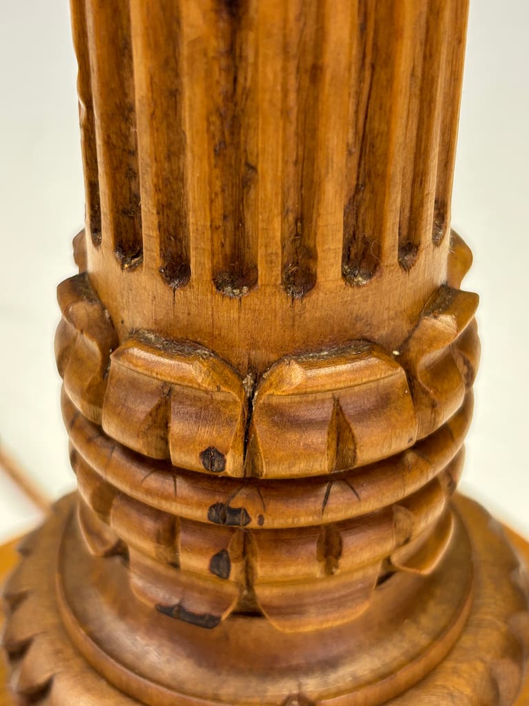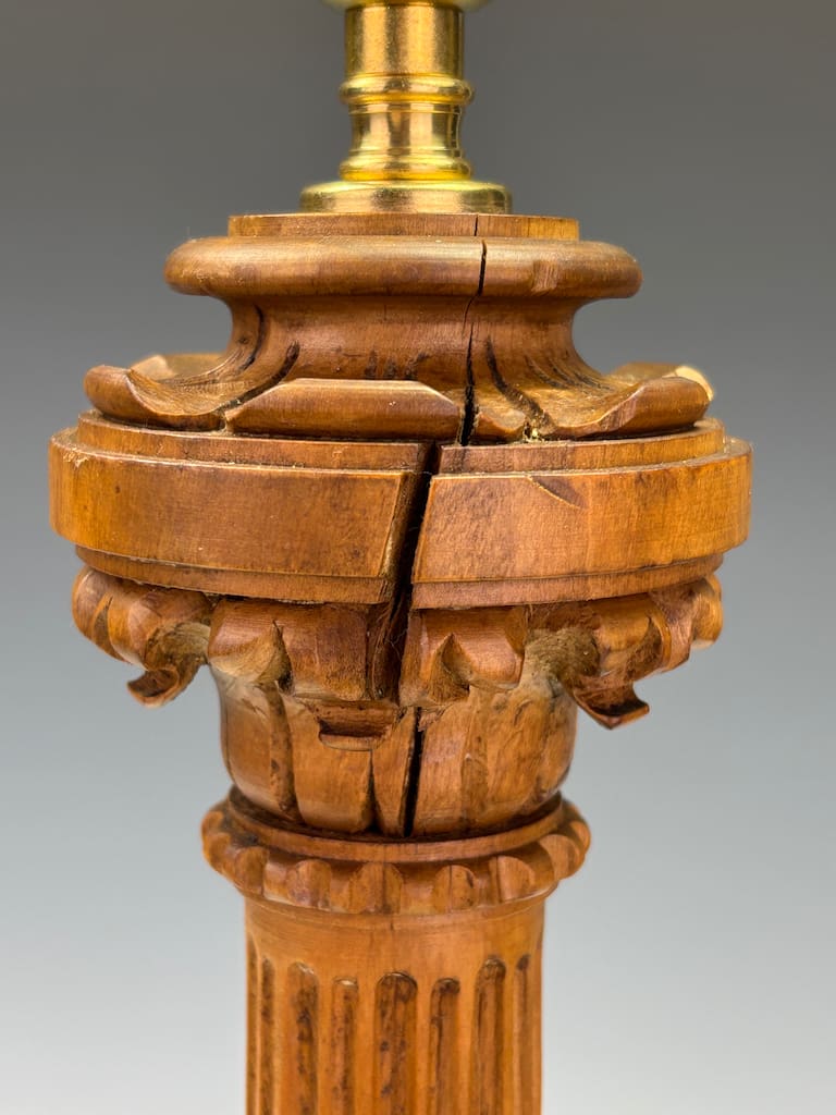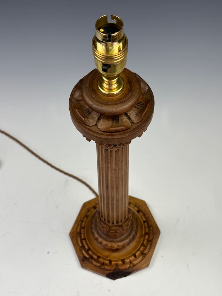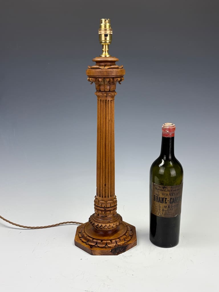 A finely carved table lamp in the classical manner, modelled after a Corinthian column with crisp fluted shaft, foliate collar and a bold octagonal base. The timber, likely oak given the warm honeyed tone and presence of a visible knot detail, offers both strength and a pleasing grain. Such natural knots are characteristic of native English and European oak, where the timber’s organic irregularities provide a charming authenticity and hint at the age of the wood.