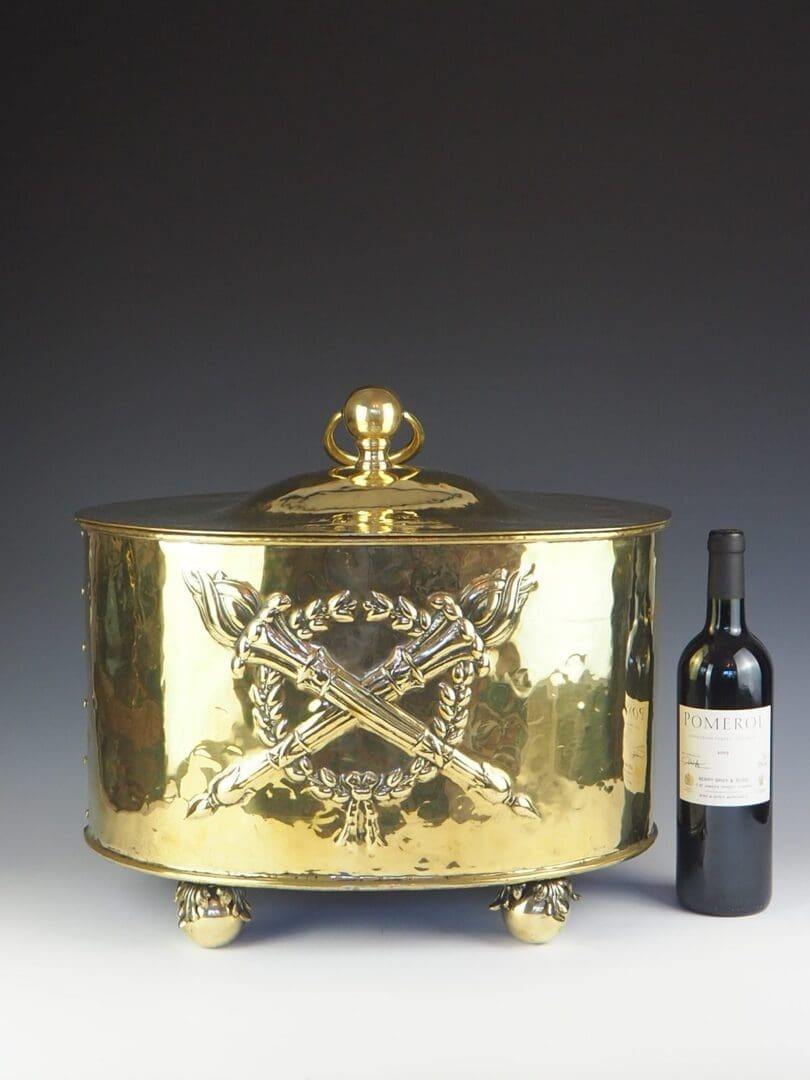 Beautiful imposing large coal bin, complete with original liner. Sat on four large ball feet decorated with acanthus leaves.