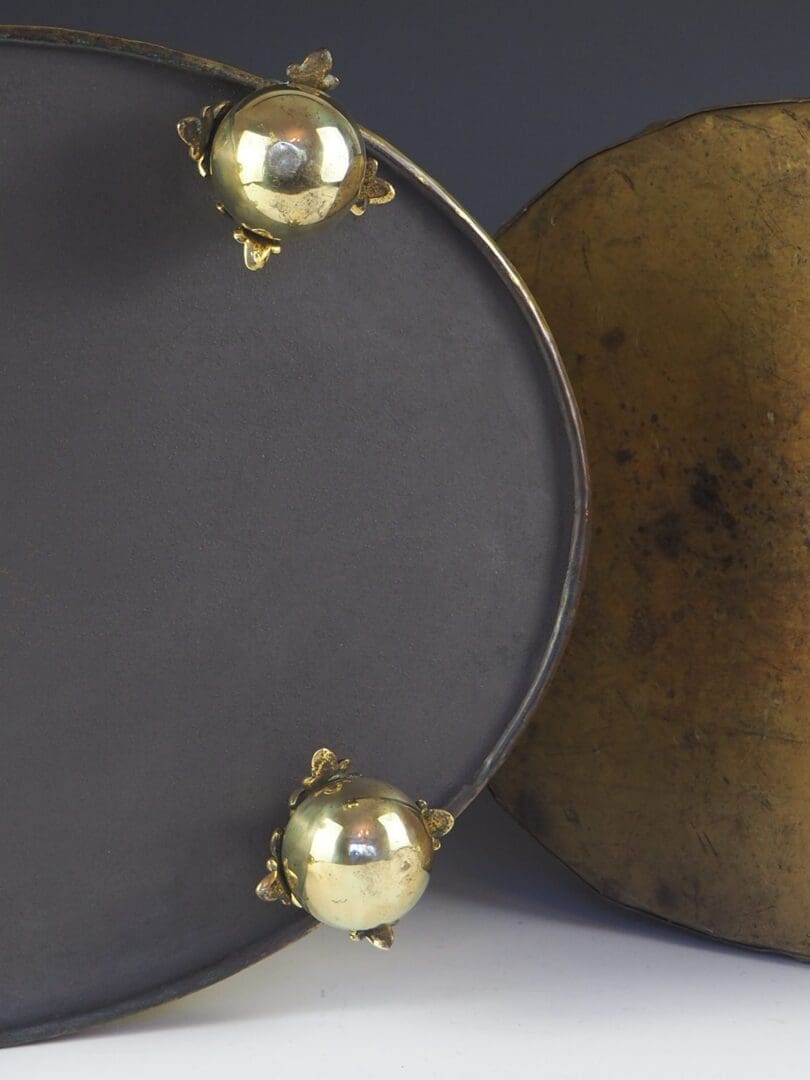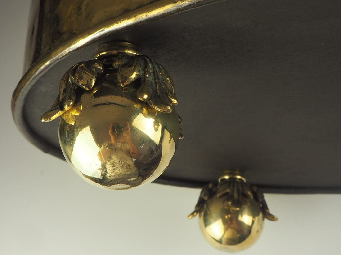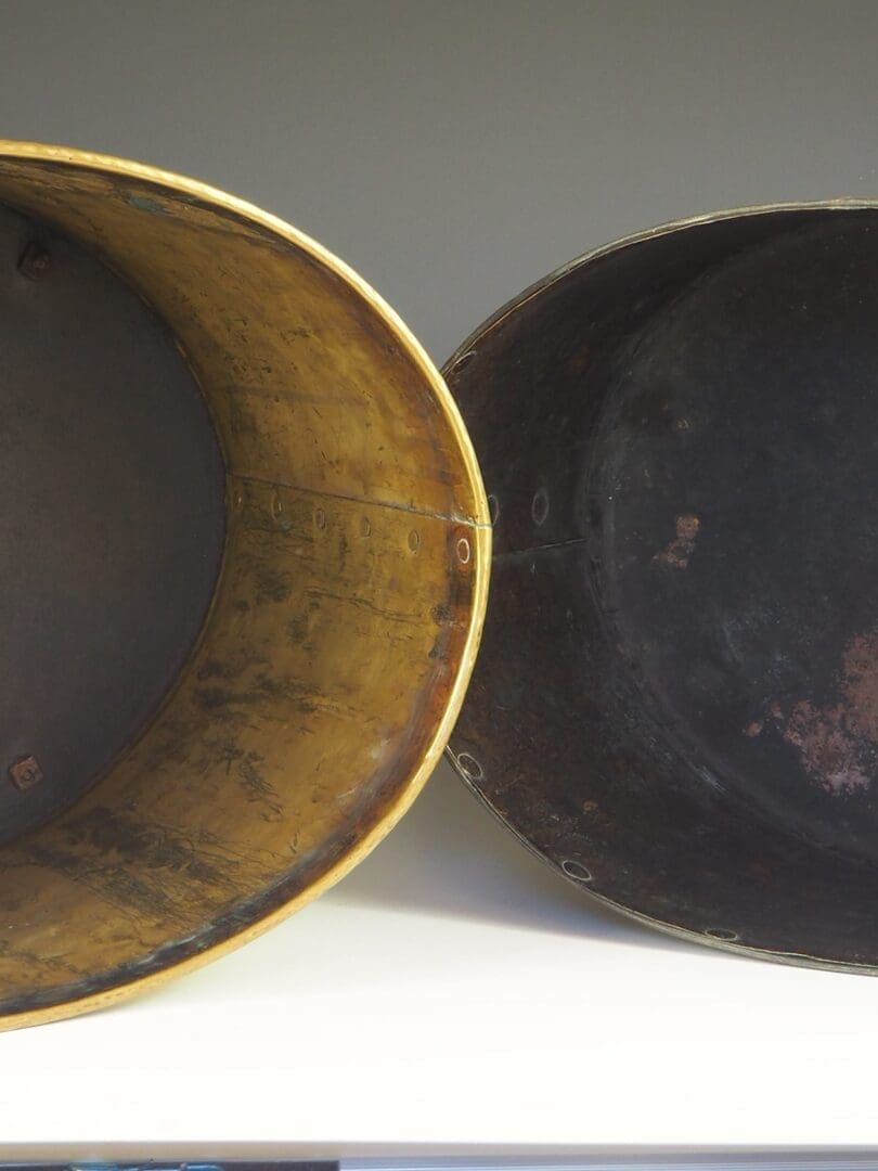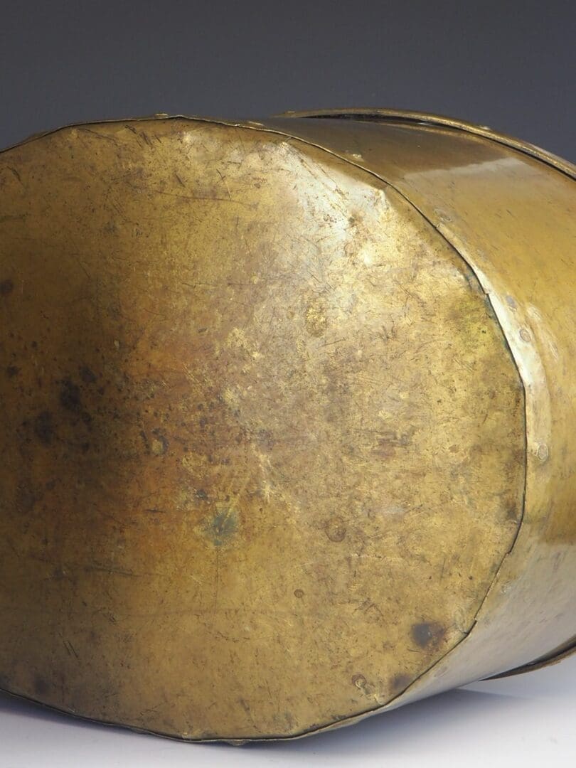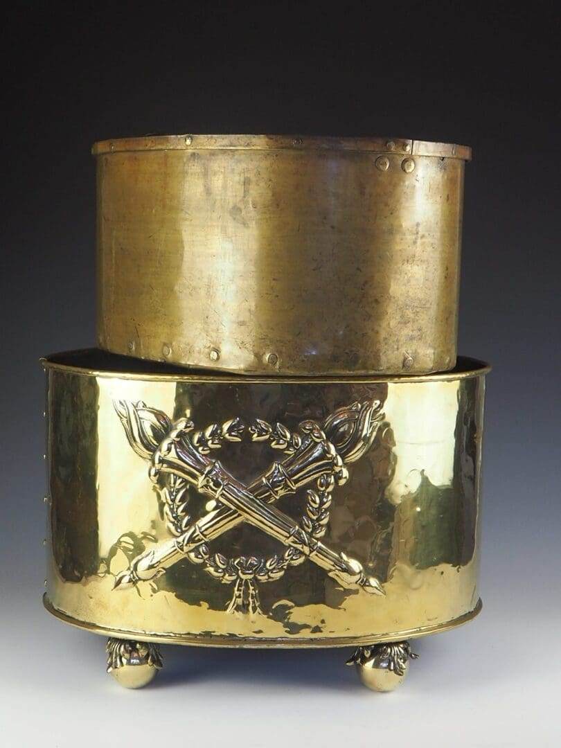Heavy gauge hand riveted in brass, complete with embossed torchere motif and repousse detailing.Â