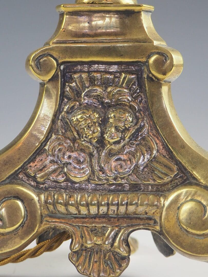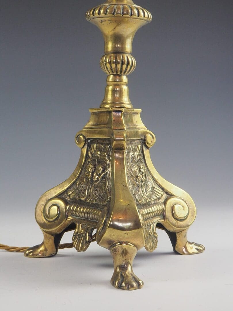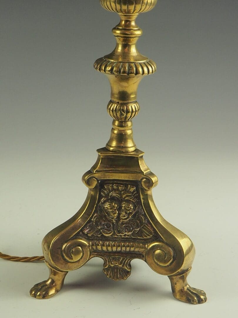 Crafted from high-quality antique brass, this lamp features intricate designs of cherubs that evoke a sense of divine beauty, while its claw feet provide a sturdy and regal foundation.