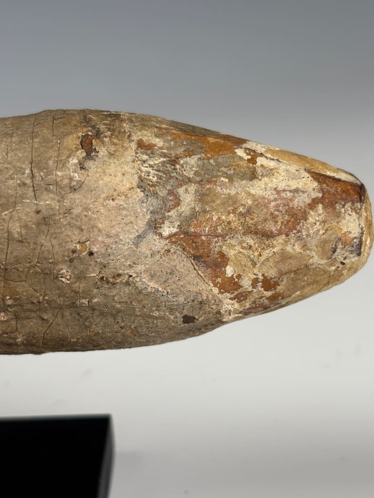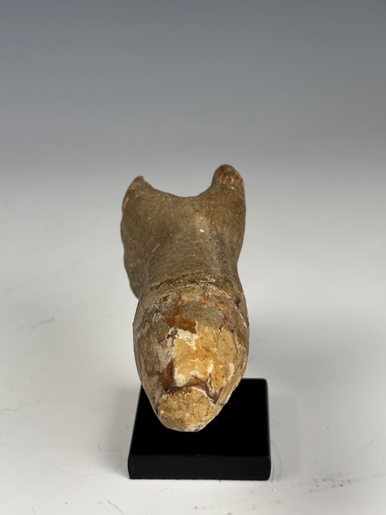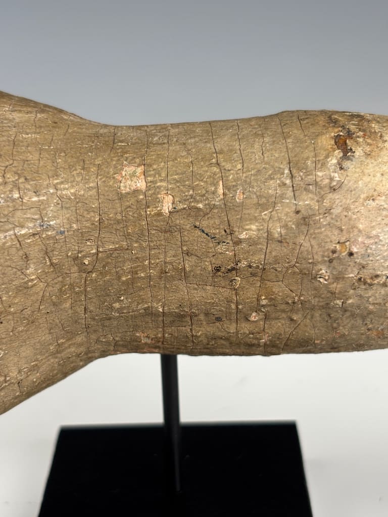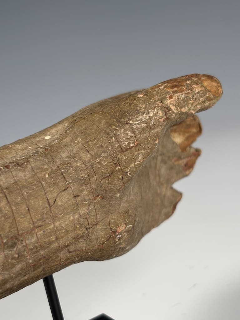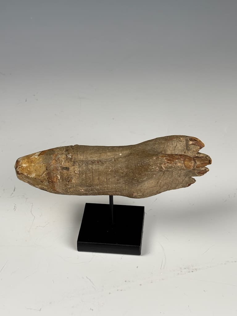 The stylistic simplicity and proportions may suggest origins in Southern Europe, possibly Italy or Spain, where such pieces were commonly used in Catholic religious iconography, altarpieces, or Santos figures (carved saints). The fragment is now mounted on a black display stand, making it an excellent piece for display or collection.