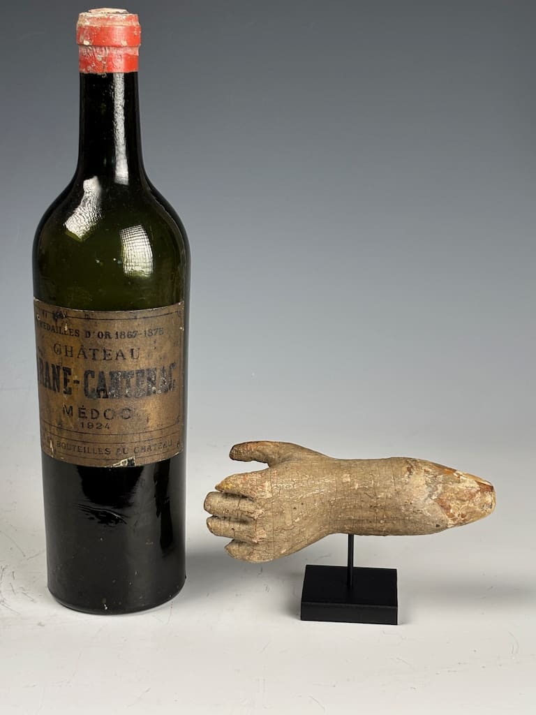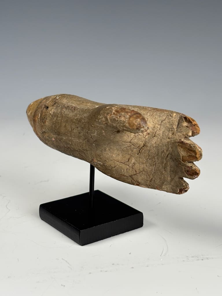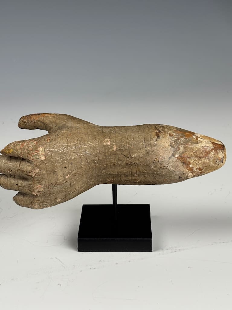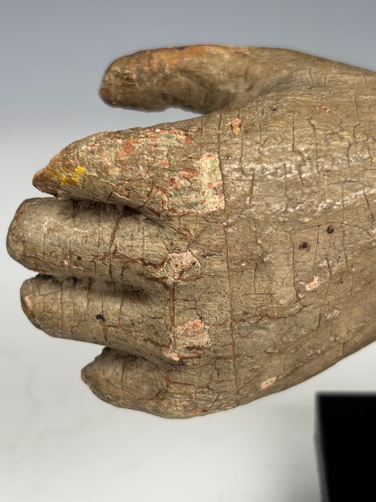 This antique gesso-painted hand fragment is in stable condition, showing expected wear consistent with age and historical use.