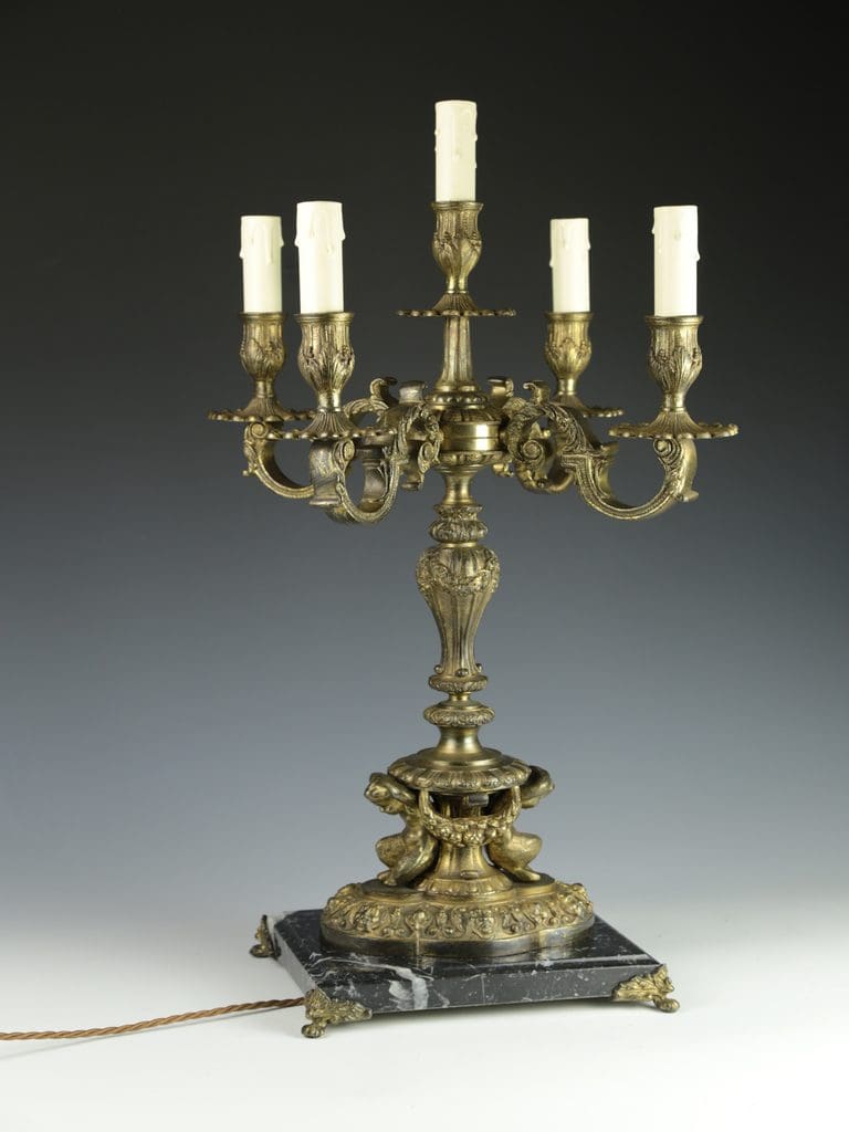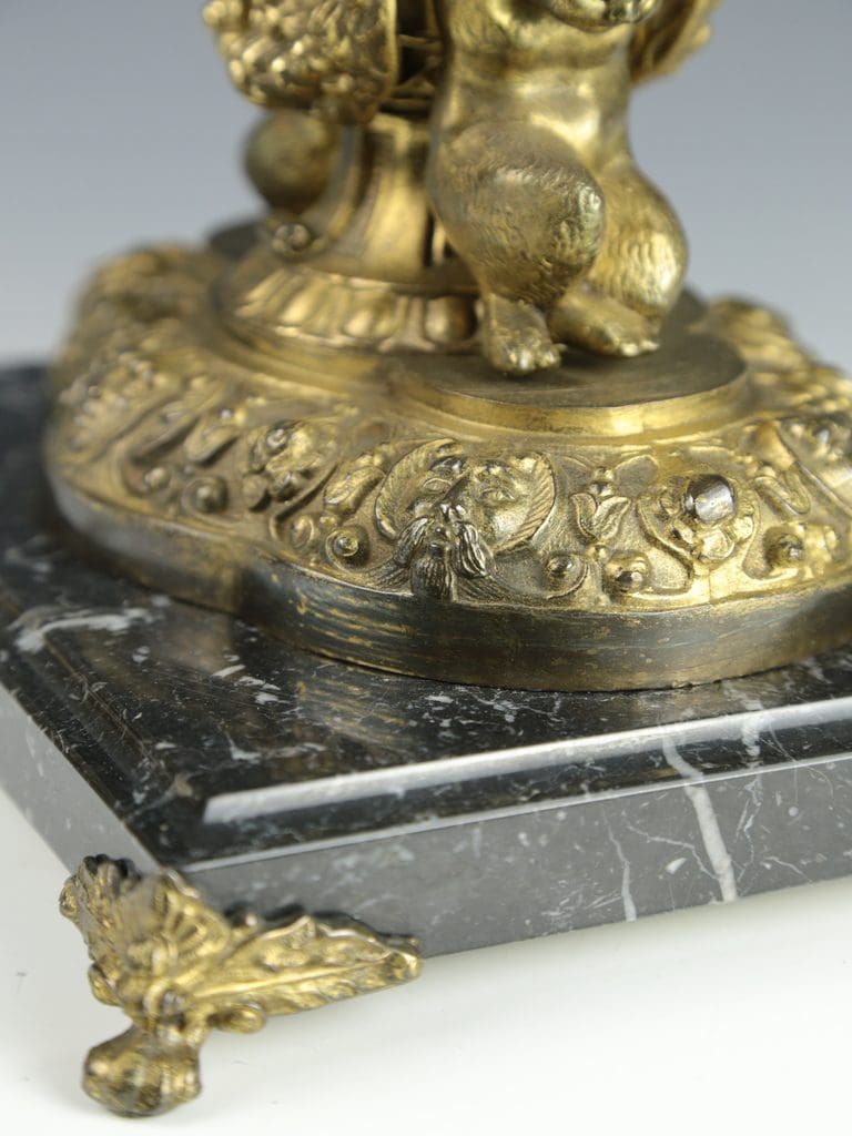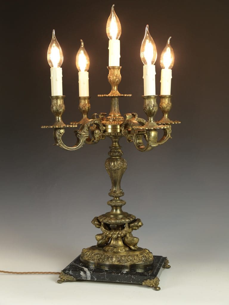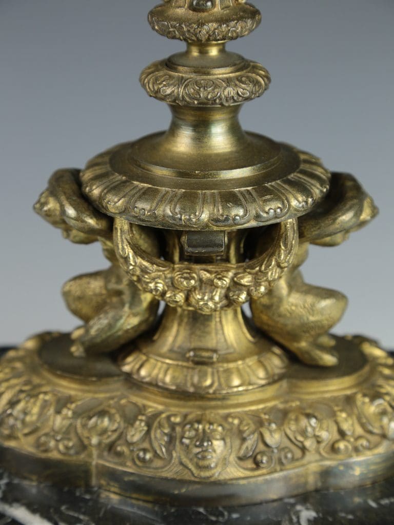 This magnificent antique candelabra table lamp radiates timeless elegance and exceptional craftsmanship. The gilt finish enhances the intricate detailing, with two beautifully cast cherubs at the base of the column in a crouched position, as though they are gracefully supporting the lamp. Surrounding the base are a series of striking gargoyle faces and decorative motifs, all resting on a black marble base raised on four delicate feet.