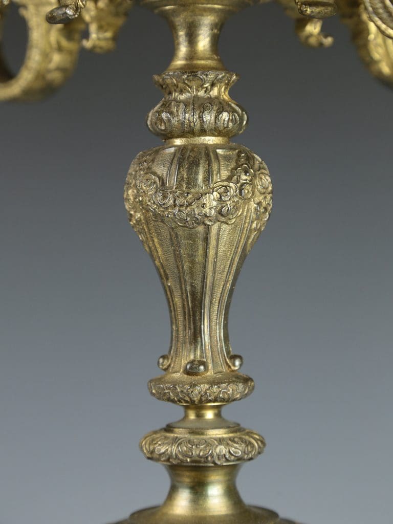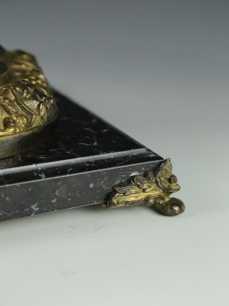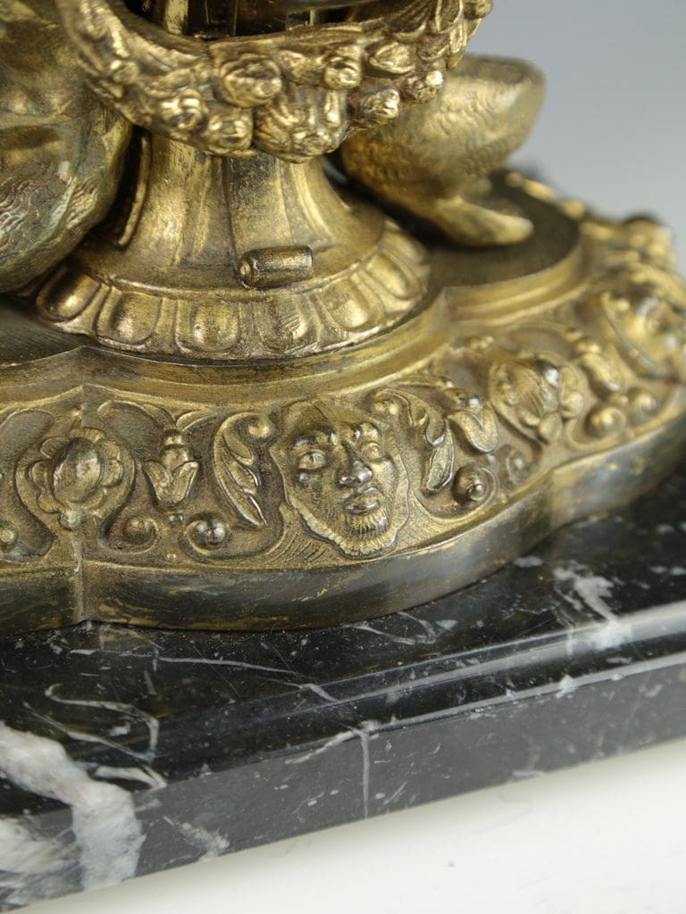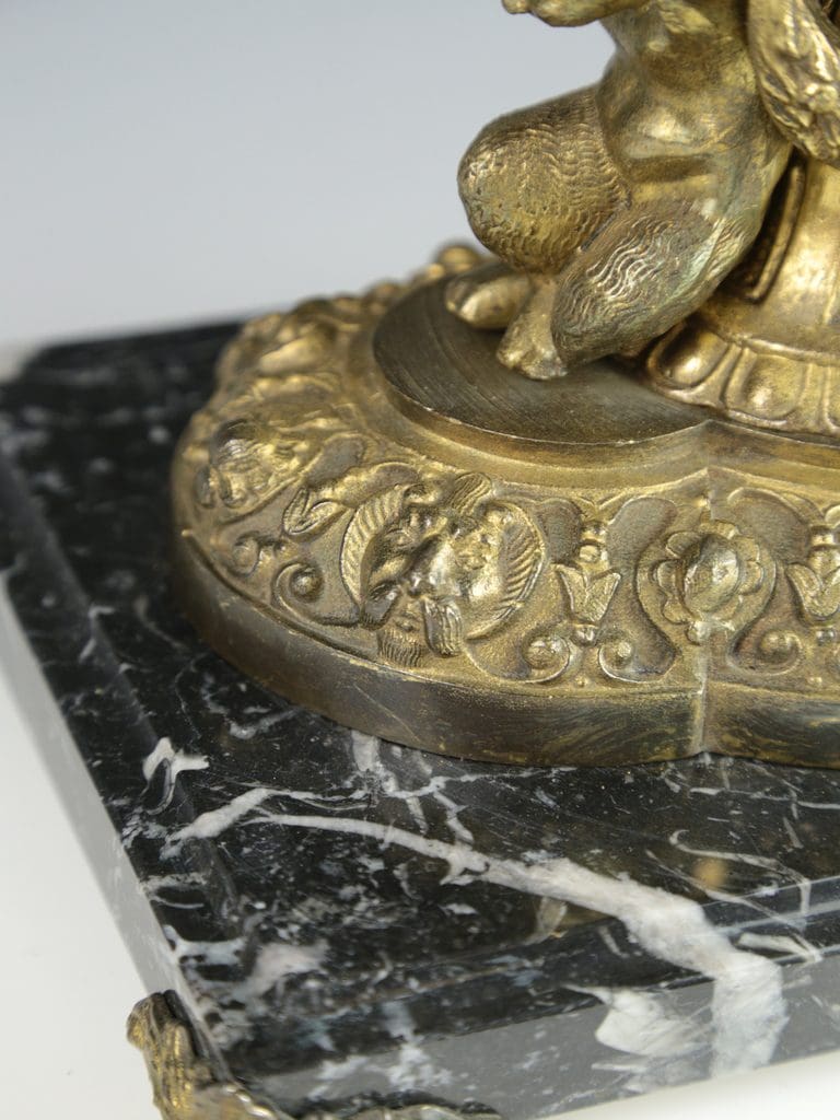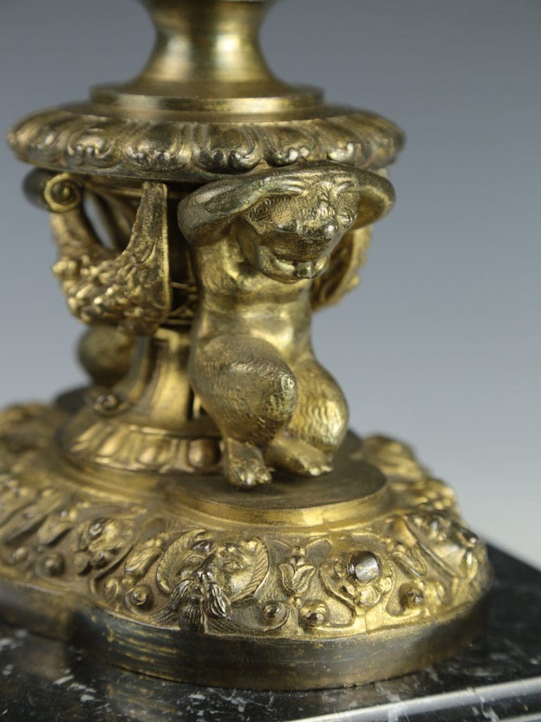 This magnificent antique candelabra table lamp radiates timeless elegance and exceptional craftsmanship. The gilt finish enhances the intricate detailing, with two beautifully cast cherubs at the base of the column in a crouched position, as though they are gracefully supporting the lamp. Surrounding the base are a series of striking gargoyle faces and decorative motifs, all resting on a black marble base raised on four delicate feet.