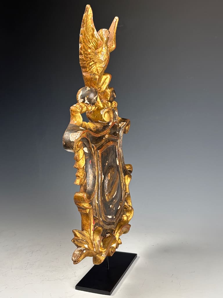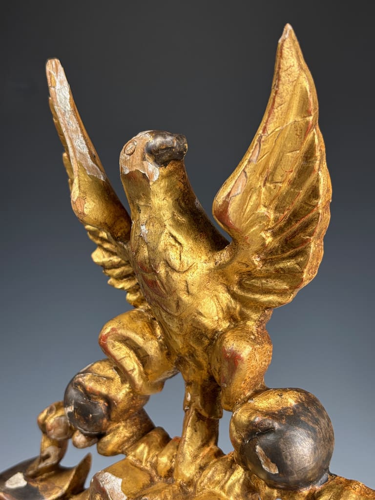 At the top of the crest sits a majestic eagle, intricately carved and perched on a twisted bar. The eagle’s talons grip two gilded spheres, a powerful heraldic symbol often associated with imperial authority, protection, and dominion—motifs used since Roman times and prevalent in Holy Roman Empire and Napoleonic heraldry.