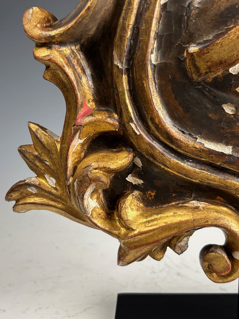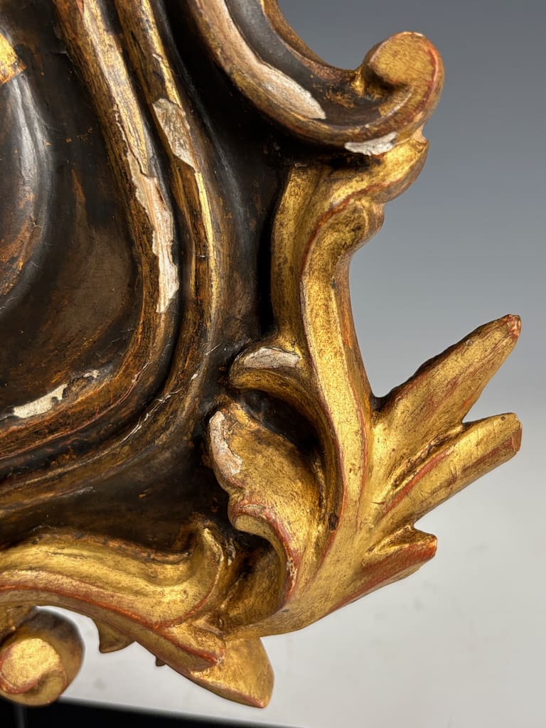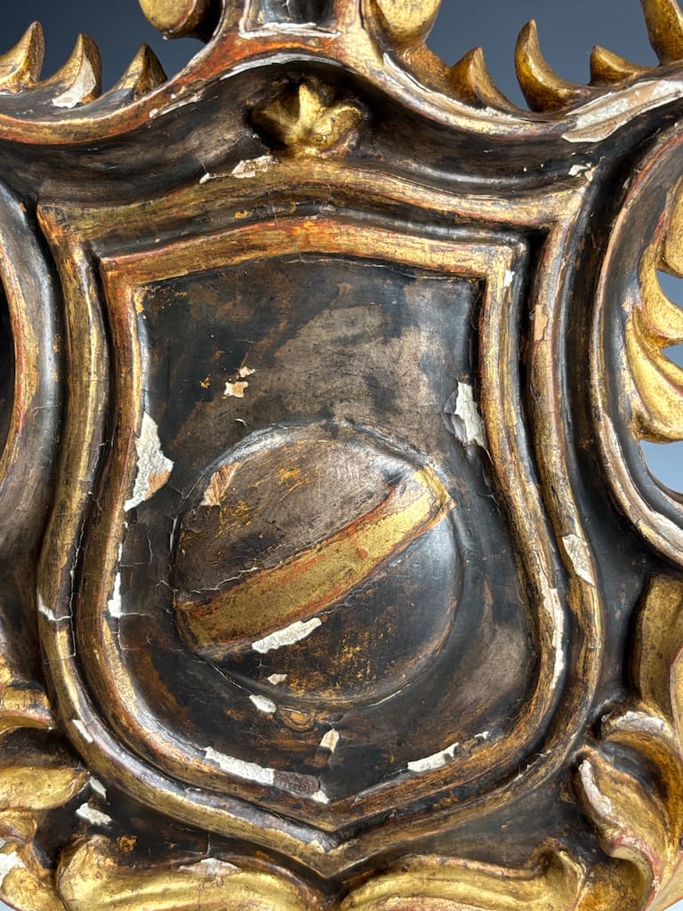 This 18th-century carved giltwood and gesso coat of arms is in very good antique condition, with age-related wear consistent with age. The gilt finish shows areas of natural patina, minor rubbing, and small losses, particularly along high points and edges, which enhance its authentic aged character.
