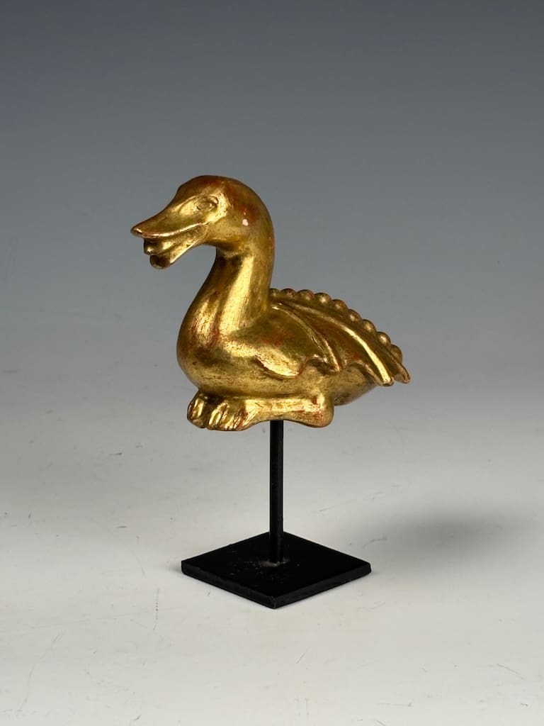 An enchanting antique giltwood sculpture depicting a mythical duck-like creature, exuding a charming blend of folk artistry and imaginative design. Finely hand-carved from wood and finished in rich gold leaf, this whimsical figure showcases exaggerated, stylized features—including a pronounced beak, arched neck, and a textured ridge along its back—suggesting a fantastical or symbolic representation rather than a naturalistic one.