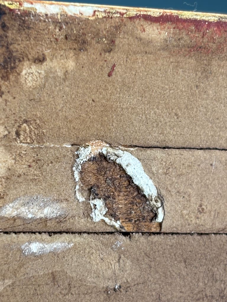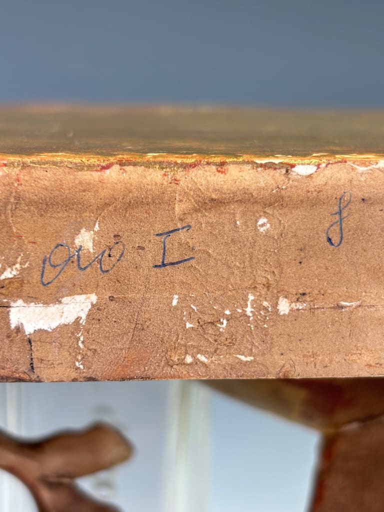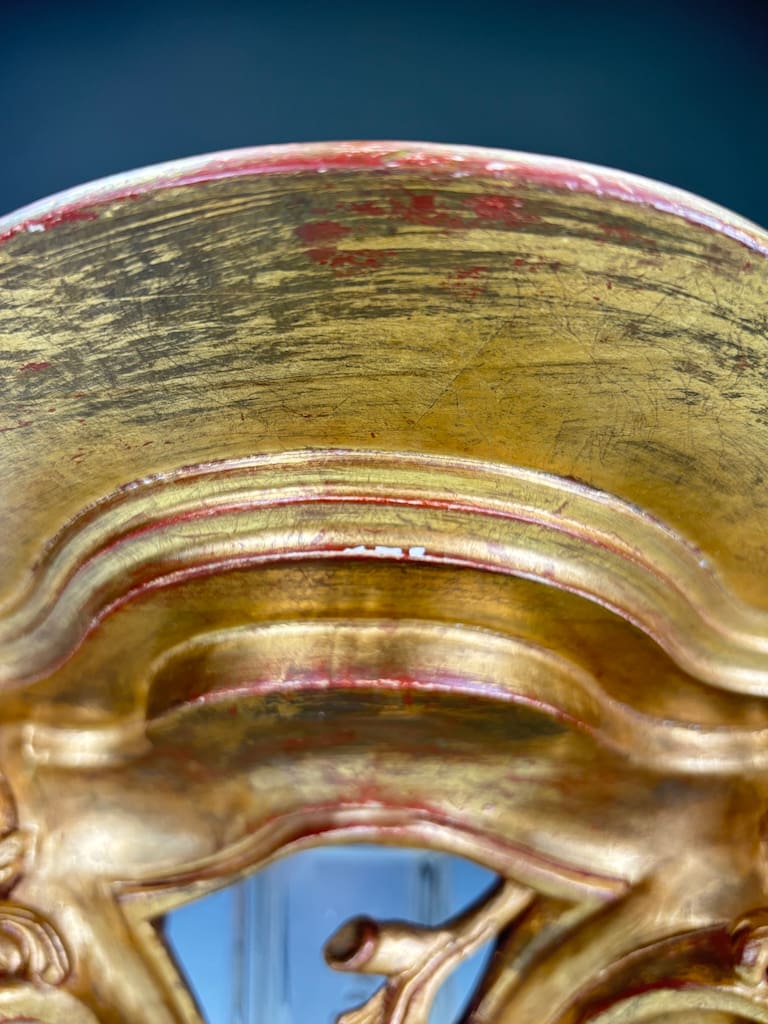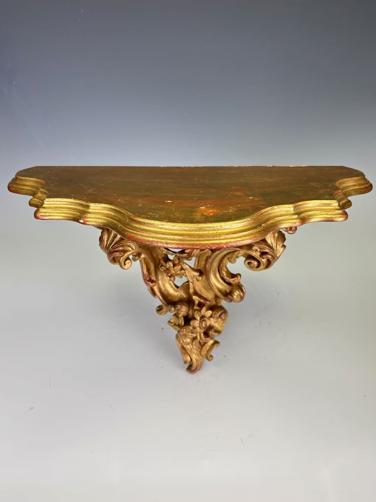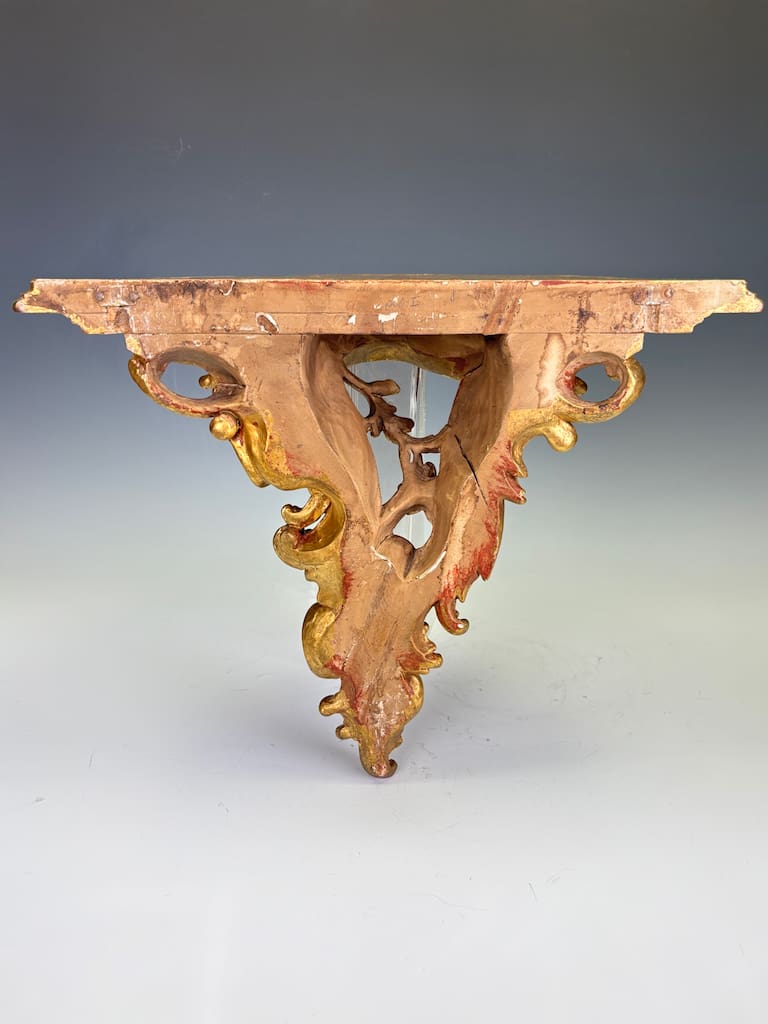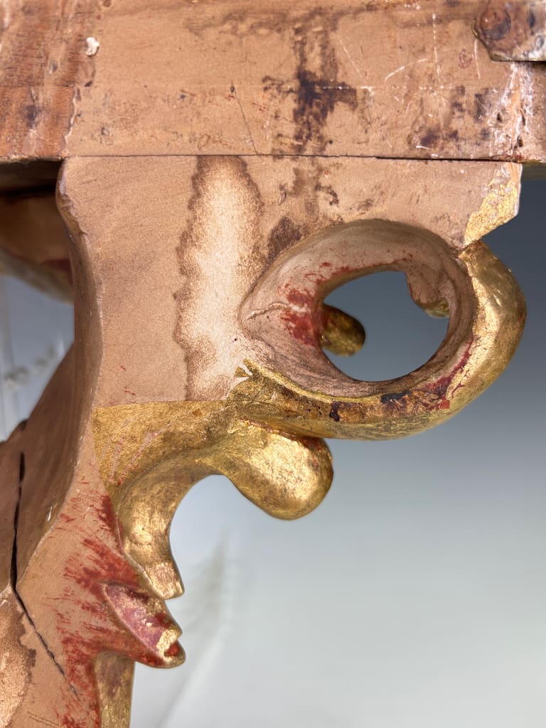 The shaped top, designed to display a vase, clock, or objet d’art, is supported by a deeply undercut framework of C-scrolls and flowers. The surface is gilded throughout, enriched with traces of red bole glowing through in areas of natural wear, giving warmth and depth to the carving.