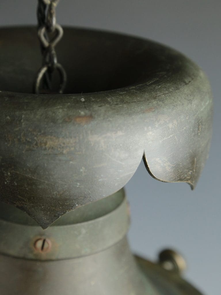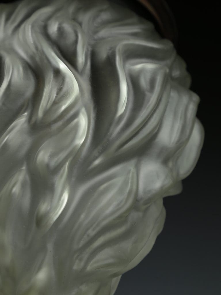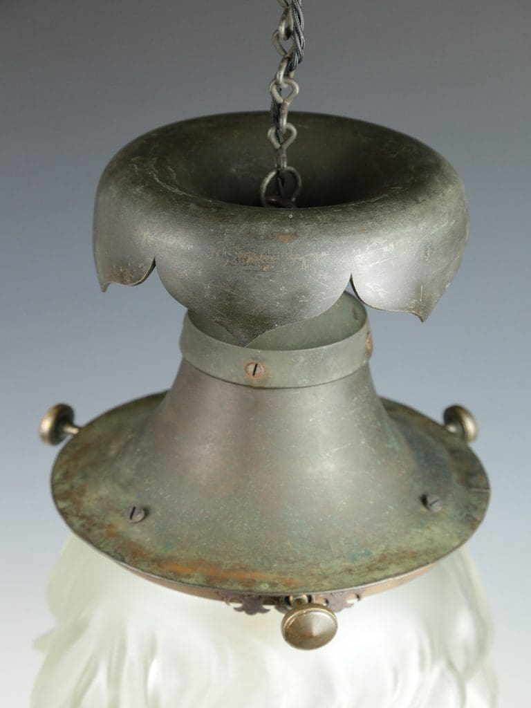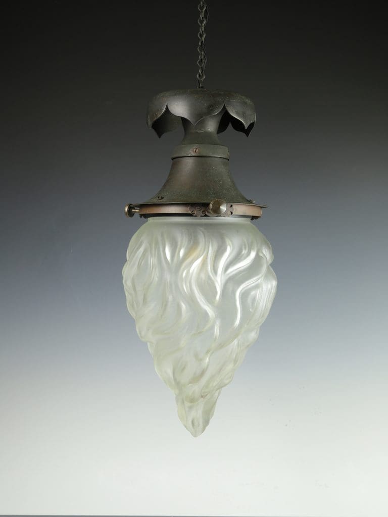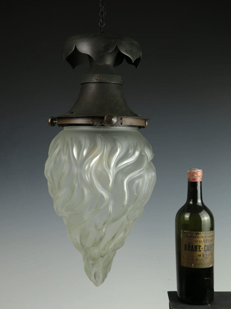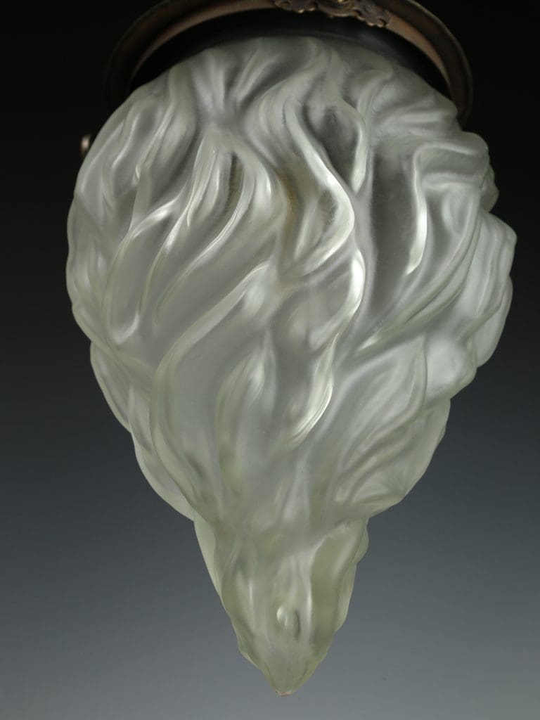 This remarkable and rare flame globe pendant boasts an impressive size and is supported by an exquisite bronze gallery. Its unique and unusual design makes it a captivating focal point in any setting.