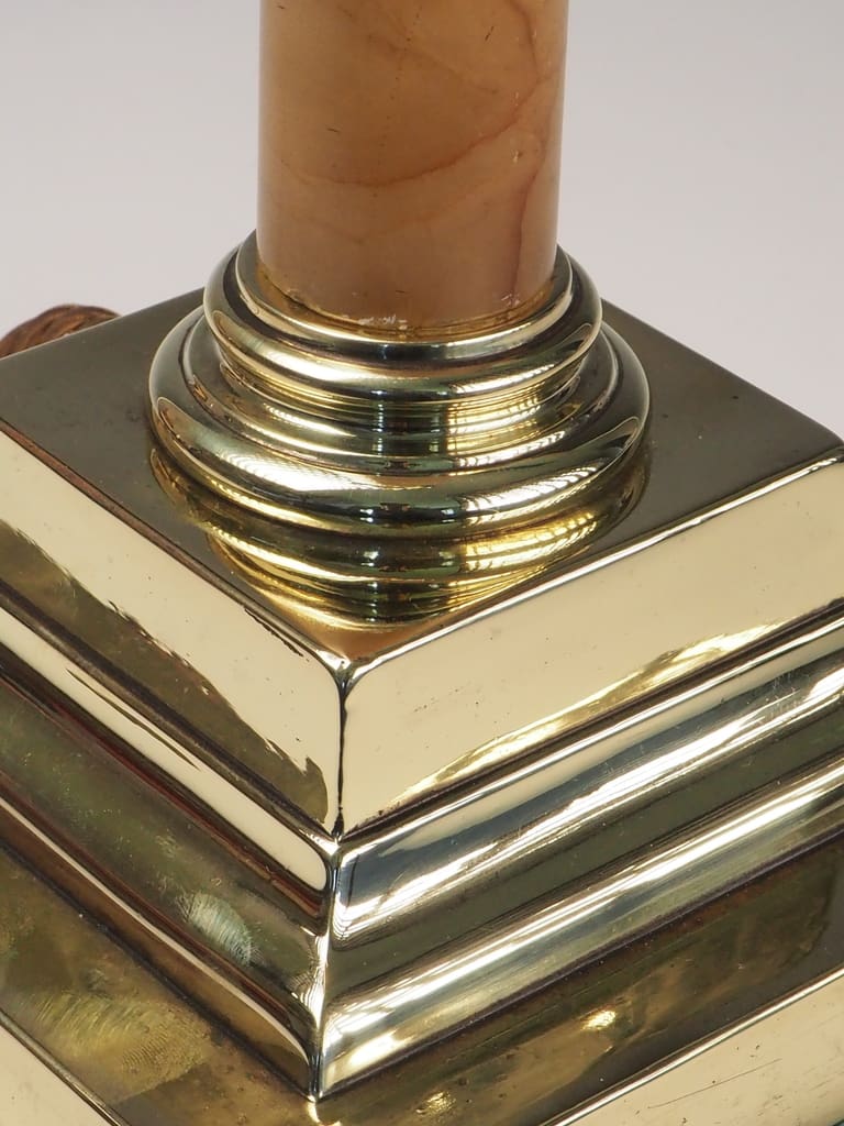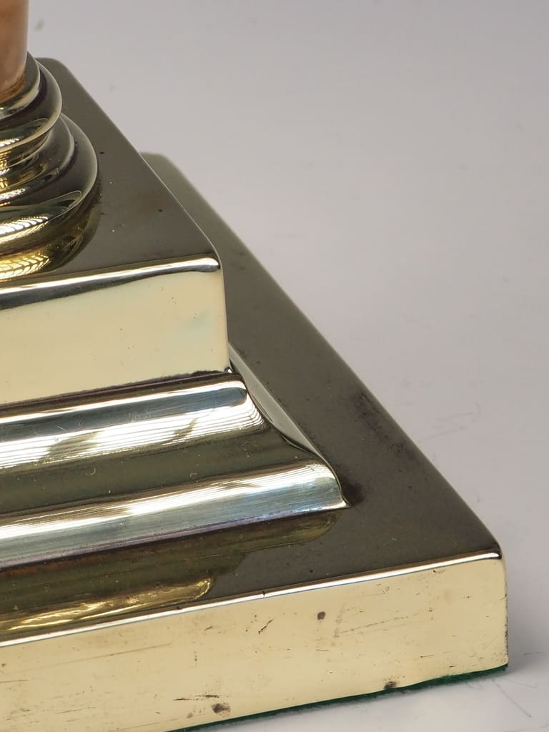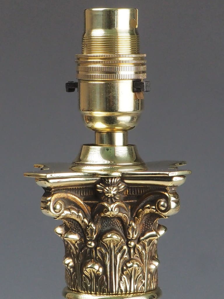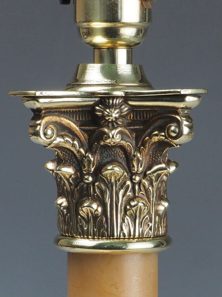 This elegant lamp features a marble column with a stepped brass base and a beautifully detailed brass Corinthian capital. The capital is richly adorned with intricate decorative motifs, while the marble showcases a vibrant and appealing color, adding timeless charm to the design.