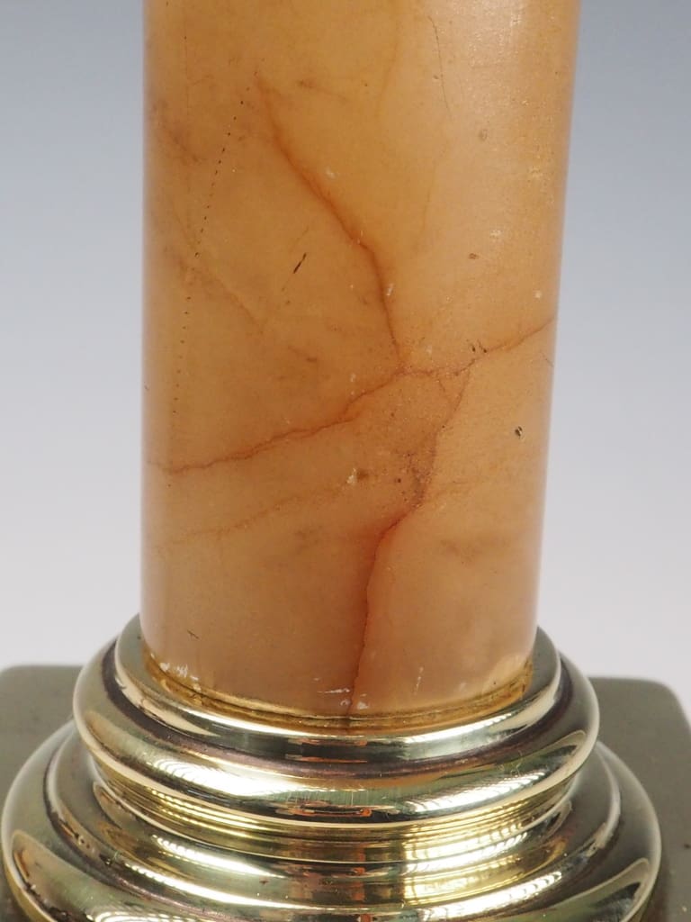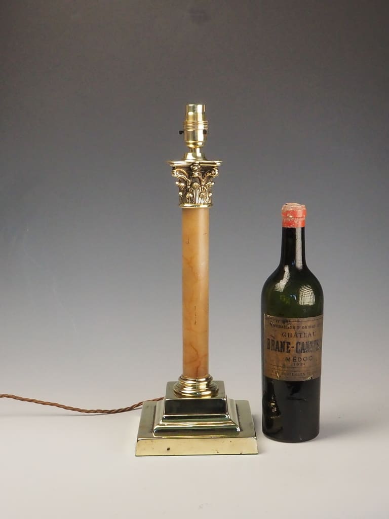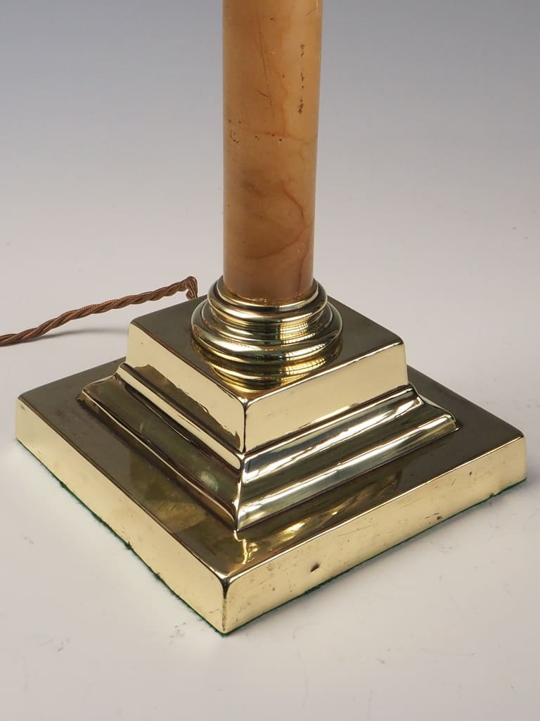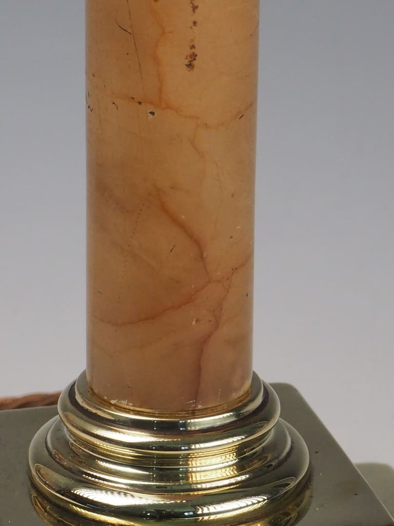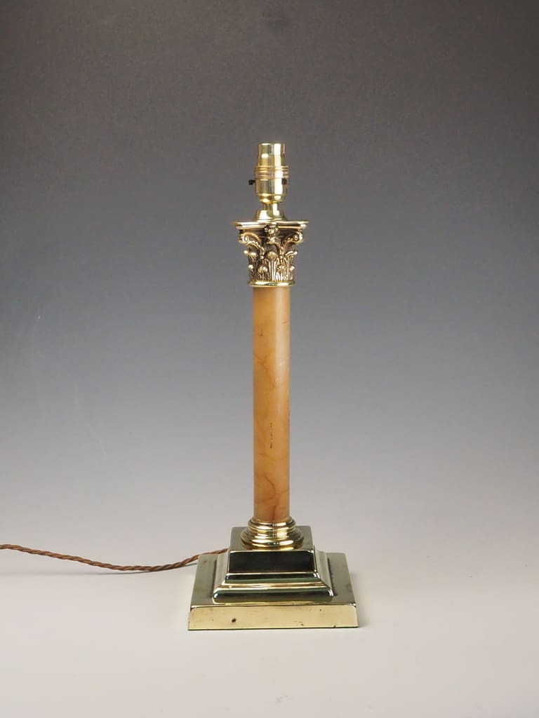 This elegant lamp features a marble column with a stepped brass base and a beautifully detailed brass Corinthian capital. The capital is richly adorned with intricate decorative motifs, while the marble showcases a vibrant and appealing color, adding timeless charm to the design.