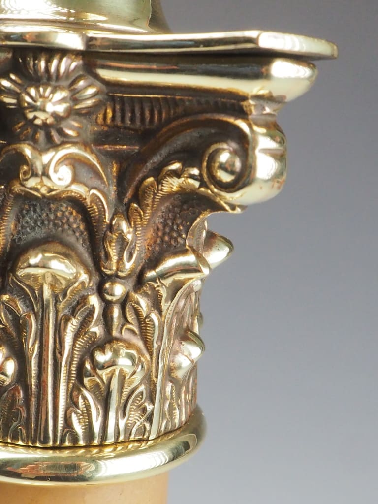 The brass capital is richly detailed, with intricate decorative motifs fully intact. Minor tarnishing or patina may be present, consistent with its age.
