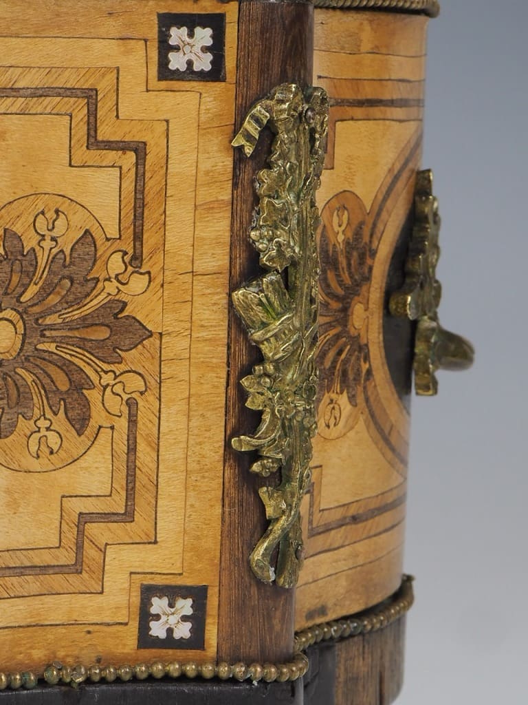 This exquisite jardiniere hails from 19th Century France. It showcases meticulous marquetry inlay, featuring fine metals, lacquer, and mother-of-pearl. The piece is adorned with intricate ormolu mounts and handles, adding a touch of elegance. The jardiniere also comes with a removable lead liner, offering both practicality and versatility.