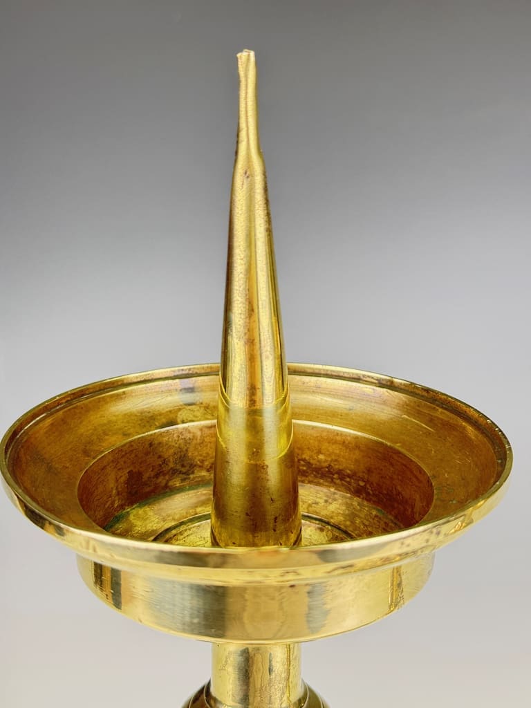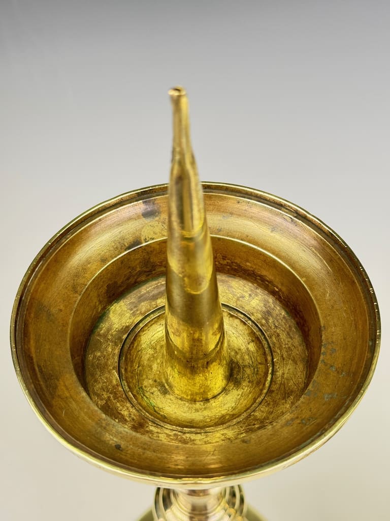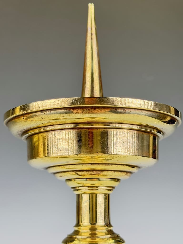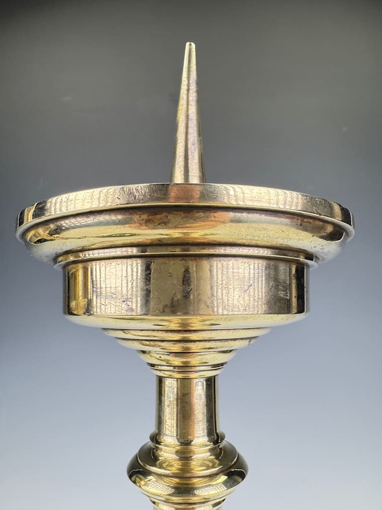 Decription A distinguished pair of 18th-century Flemish brass pricket candle holders, richly turned and cast with exceptional weight and form. Each candlestick features a tall central pricket (spike) for securing large taper or wax candles, set atop a wide, stepped circular base — a classic design rooted in the Baroque period of the Southern Netherlands.