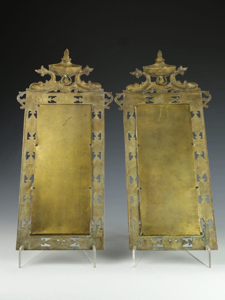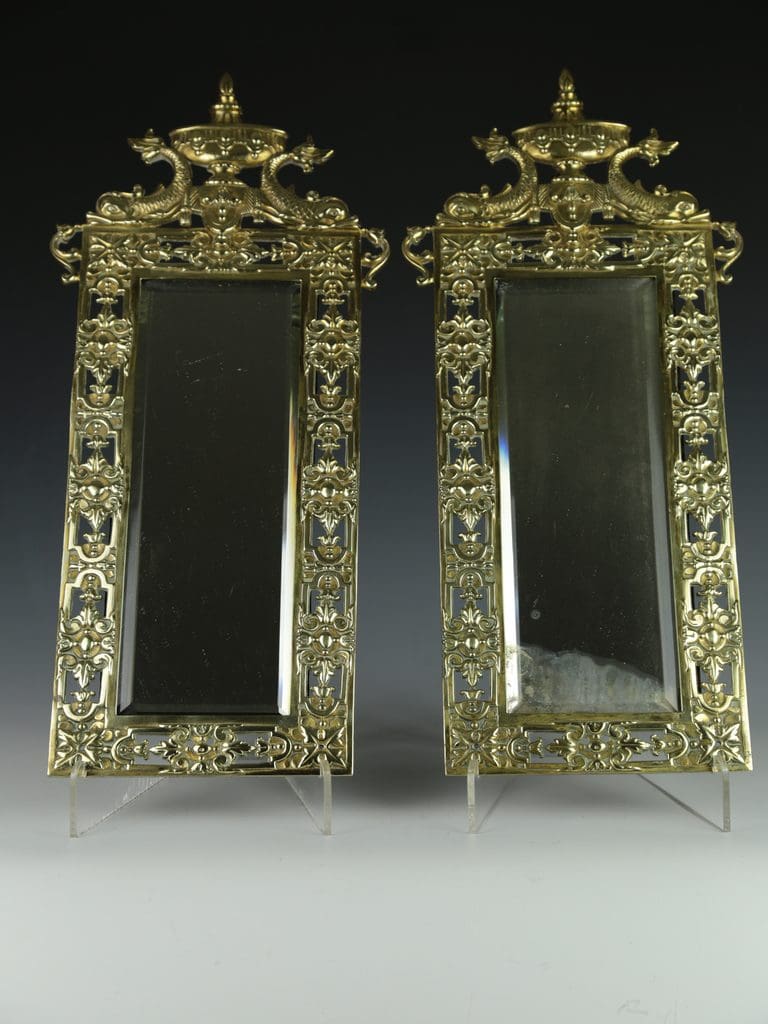 The brass frame of both mirrors is in very good condition, retaining its structural integrity and showing only minor signs of wear consistent with age.