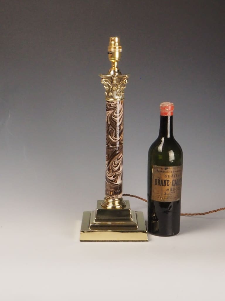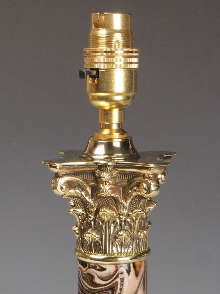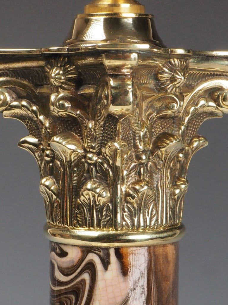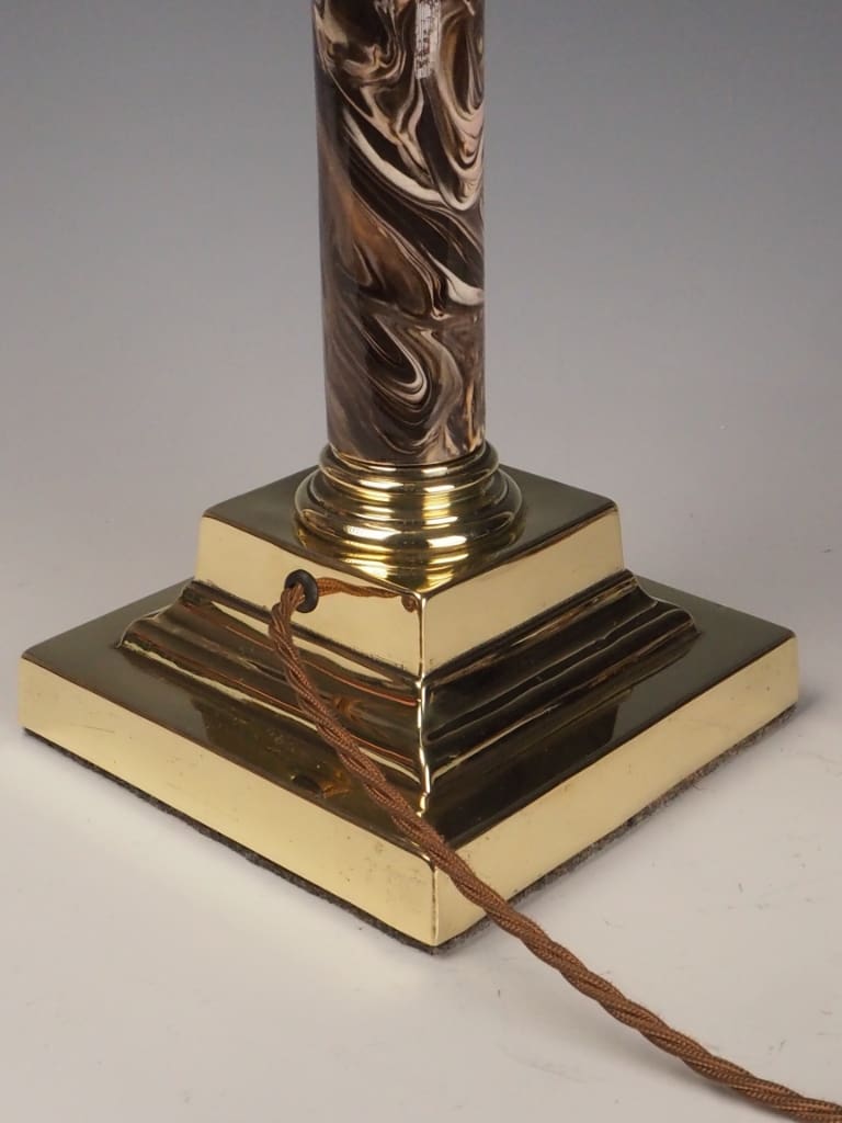 The lamp features a porcelain column with a rich marble effect glaze, designed to emulate the timeless appeal of real stone. Topped with a detailed brass Corinthian capital and set upon a classic stepped brass base, this piece pays homage to the architectural grandeur of ancient Greece and Rome, reinterpreted through Victorian and Edwardian design sensibilities.