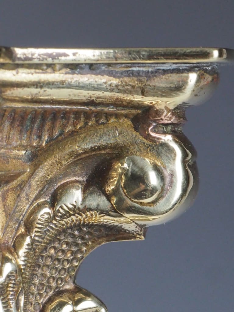 Brass Corinthian capital is structurally sound and detailed, showing light patina in keeping with age. Stepped brass base is stable and well-preserved, with minor surface wear typical of antique pieces.