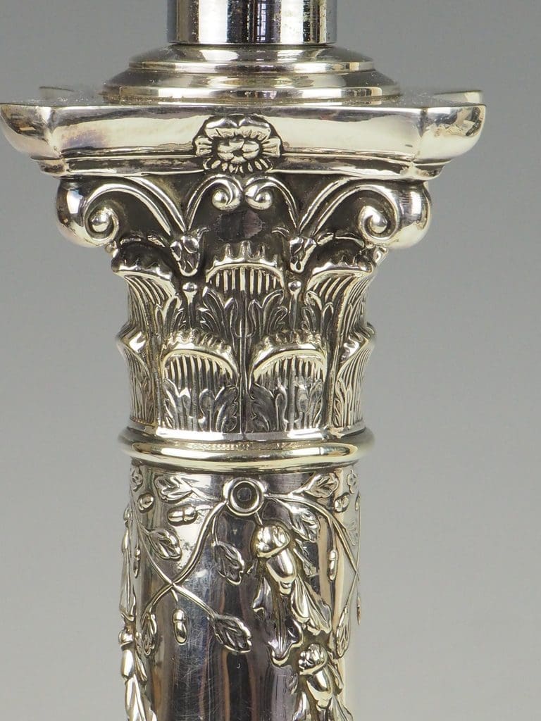 Immerse yourself in the timeless allure of this exceptional Antique Silver Plate Corinthian Column Table Lamp, a piece that beautifully marries classical design with rich historical significance. This large, weighted table lamp is a captivating example of craftsmanship, adorned with a graceful twisted vine that ascends the fluted column, culminating in a richly detailed capital inspired by the grandeur of classical Corinthian architecture. Its base, with classical urn motifs and draped swags, further exudes refined opulence.