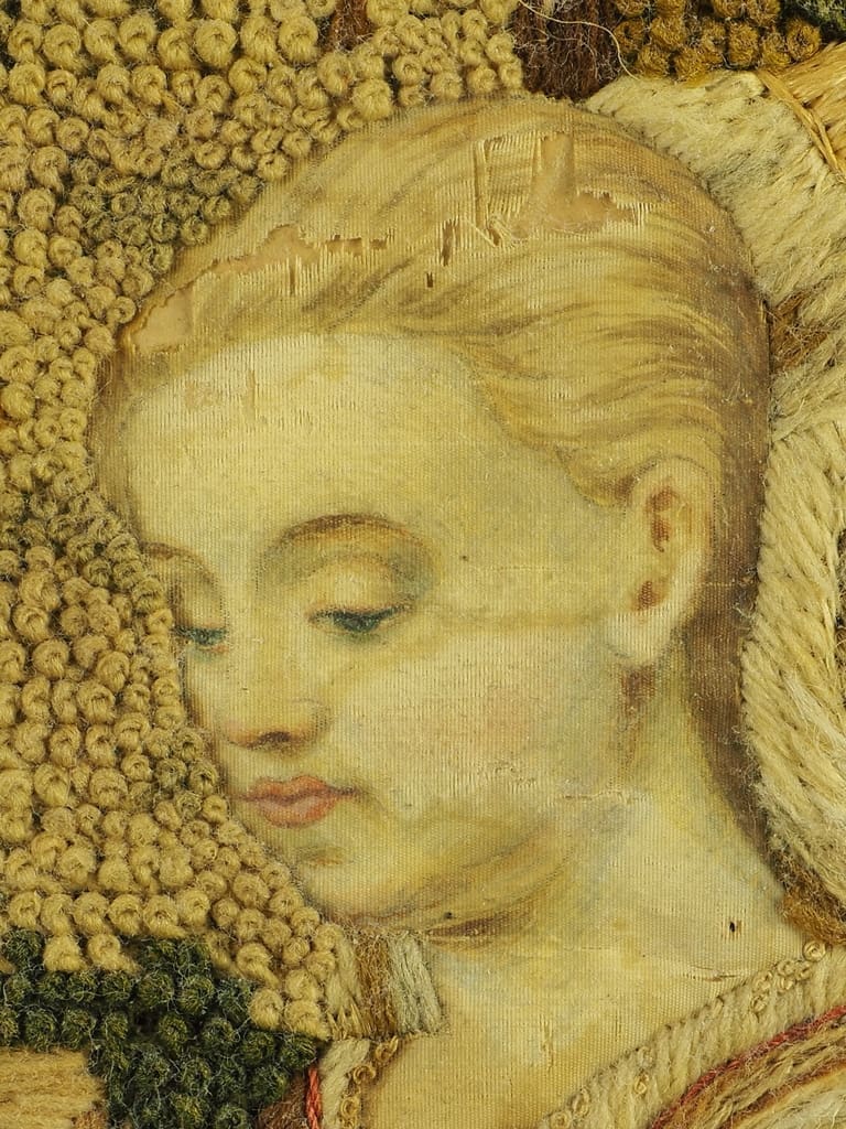This is a very early tapestry with the 'Royal College of Needle Art' label on the reverse. We have made contact with them and it's an early label from when they opened in 1876 and was issuing needlepoint works and providing a cleaning service for other tapestry works.