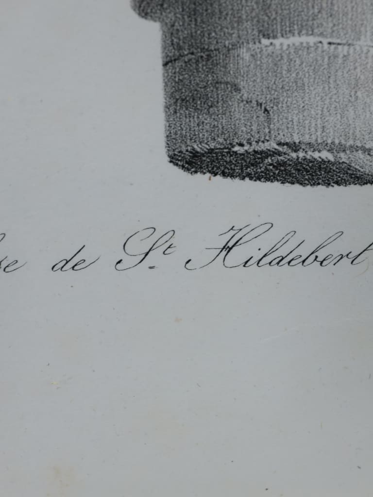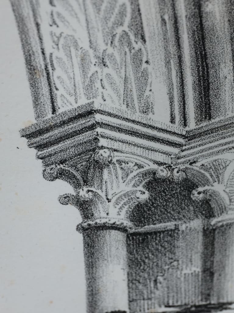 The work is dated in the plate Fragonard 1822. It masterfully captures the deep-set moldings and the weathered, tactile quality of the medieval stonework. Fragonard’s expertise is particularly evident in the subtle graduated shading, which conveys a sense of immense scale and the hushed, hallowed atmosphere of the Romanesque interior.