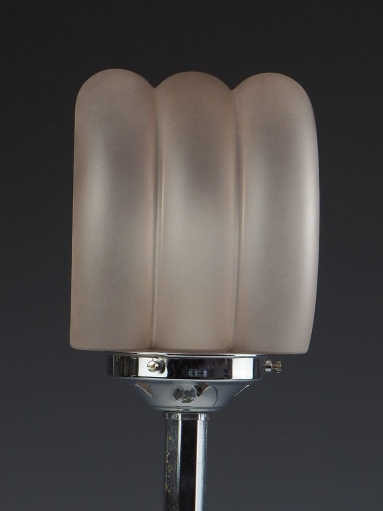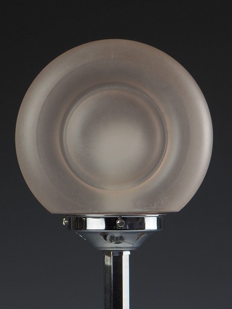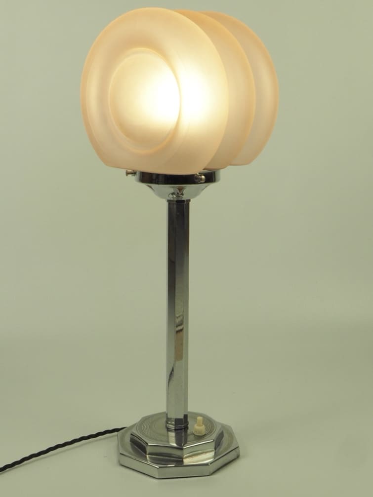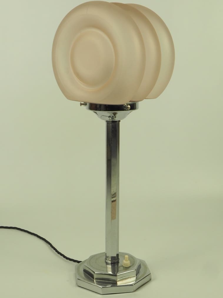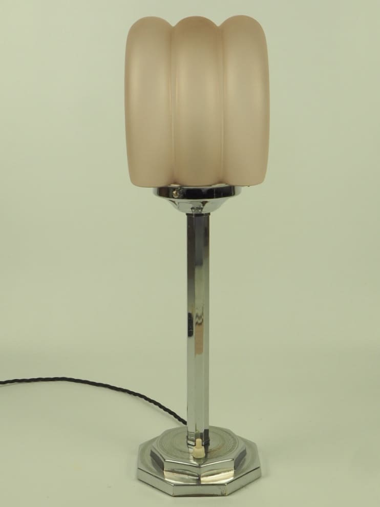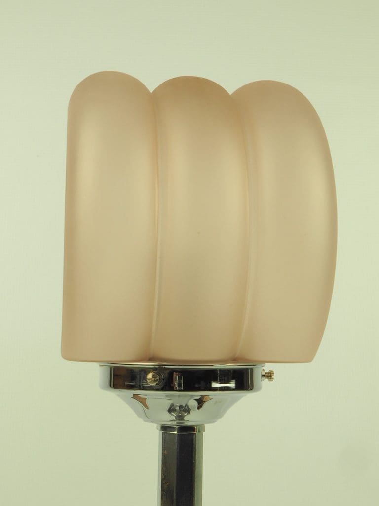 Art Deco Lamp in Chrome with a Hexagon Shaft and Rare Art Deco Pink Frosted Globe