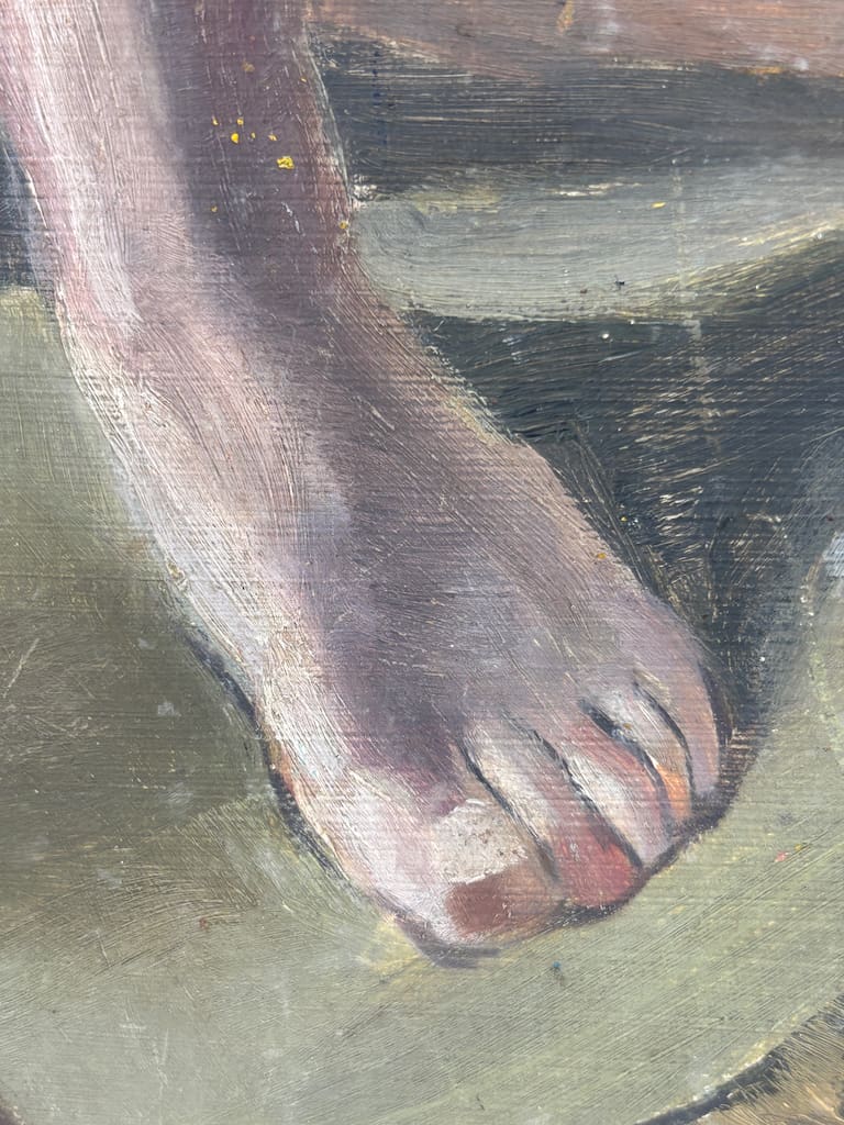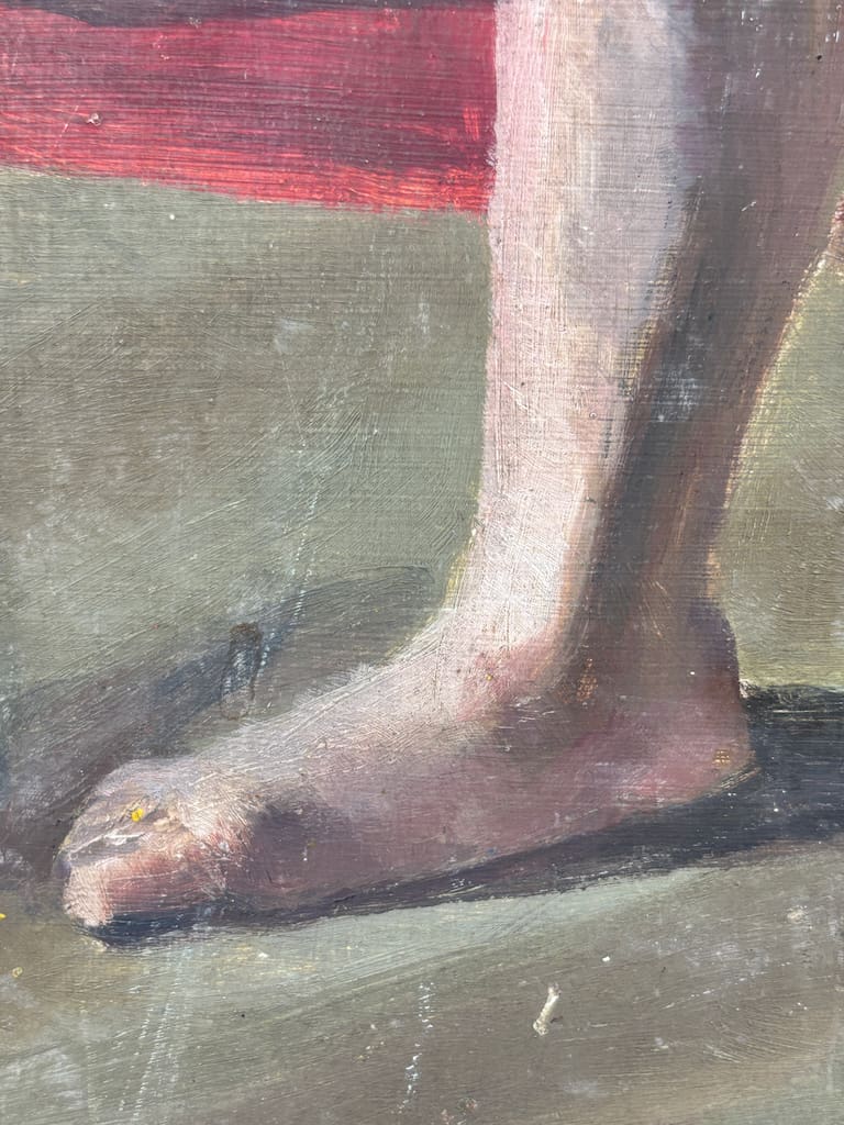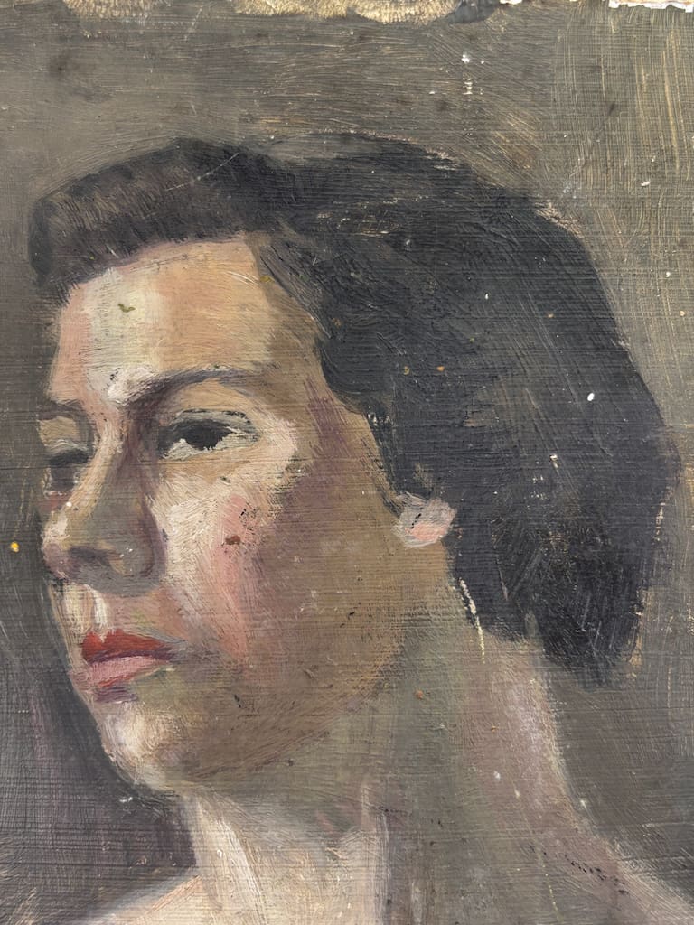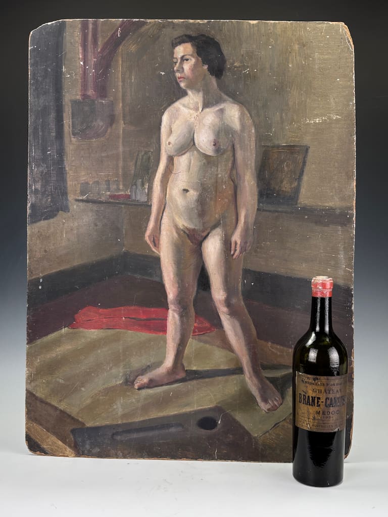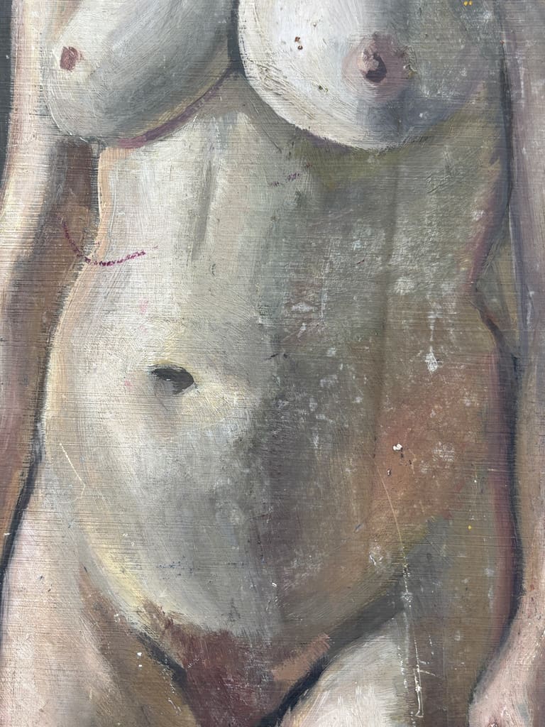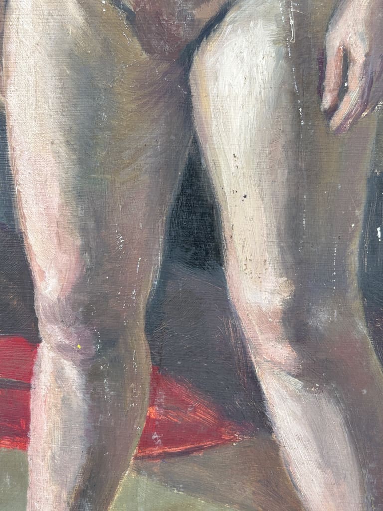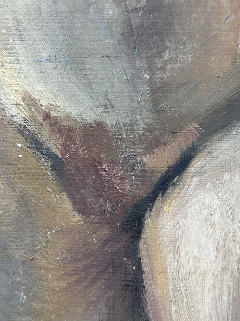 The unframed canvas laid on panel (or board) invites as much appreciation for the artist’s spontaneous brushwork as for the sitter’s introspective purity. The composition’s restraint and compositional clarity speak to Underwood’s academic training, while the softly observed lighting and the sitter’s calm presence evoke a quiet modernism. Whether viewed as a standalone work or as part of a mid‑century British nude canon, this piece presents a refined aesthetic statement worthy of elevated interiors and discerning collections.