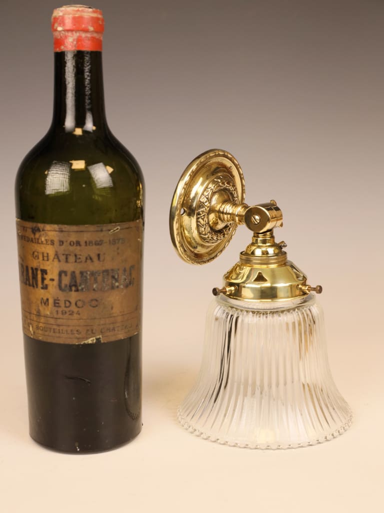 A refined Art Nouveau wall light in solid brass, distinguished by its flowing, sculptural form and original holophane rib glass shade. The design is characterised by an elegant continuity of line, from the richly worked circular backplate through the articulated arm to the softly flared shade, reflecting the Art Nouveau ideal of organic form integrated with function.