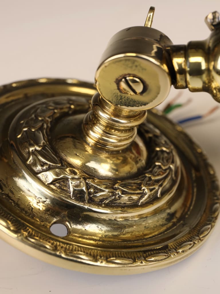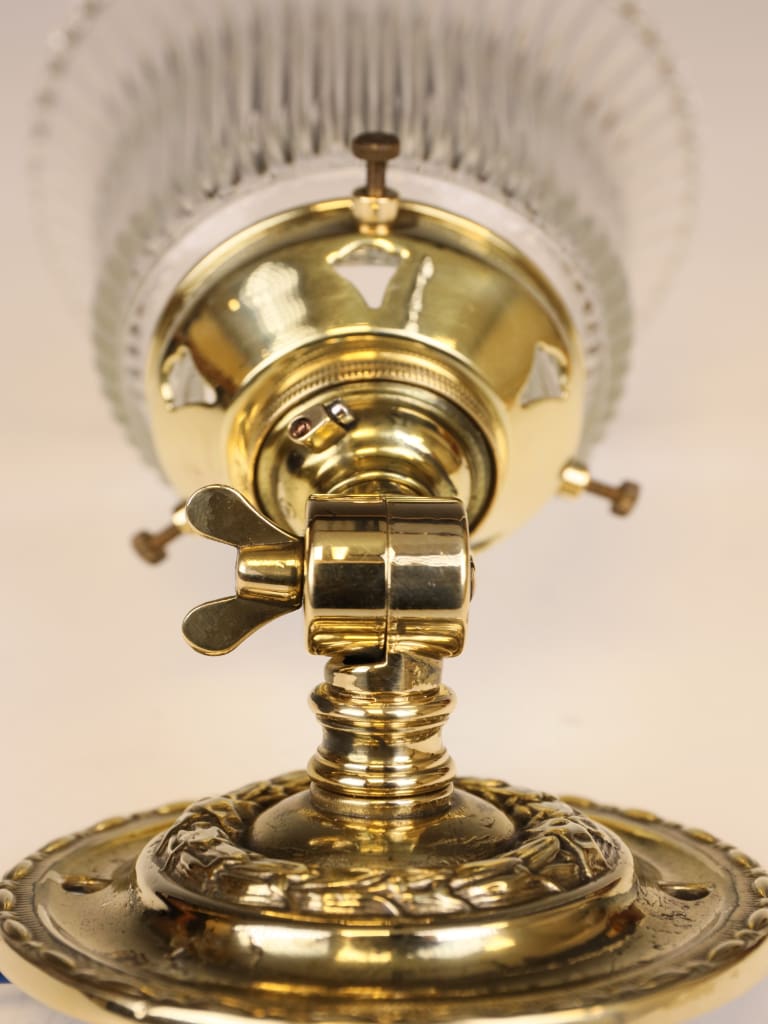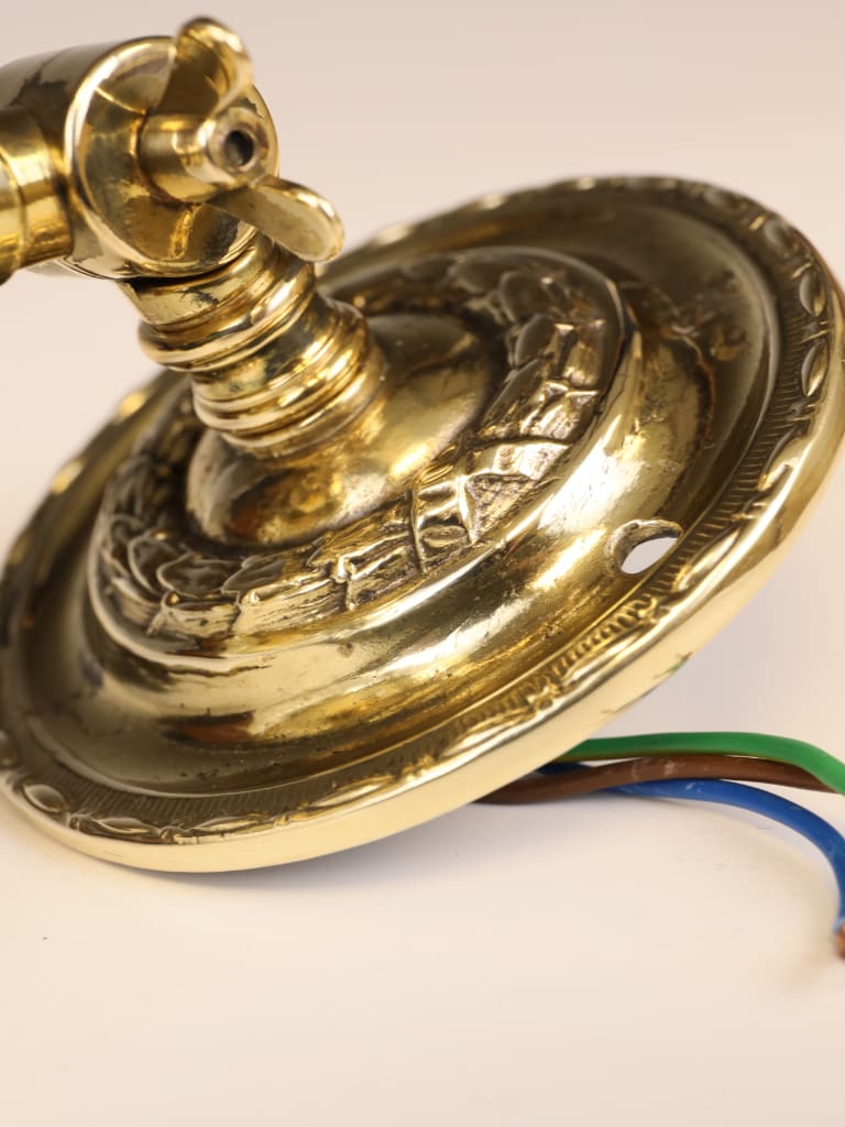 The cast brass backplate is ornamented with subtle foliate relief, integral to the structure rather than applied, a key characteristic of Art Nouveau decorative philosophy. The adjustable arm and pivoting gallery demonstrate the period’s embrace of modernity and practicality, allowing the light to be precisely directed for use as a picture or task light.